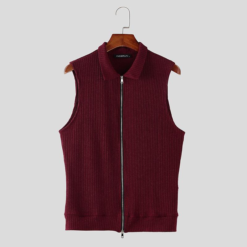 INCERUN Мужские летние топы с отворотом на молнии без рукавов в рубчик