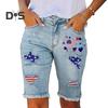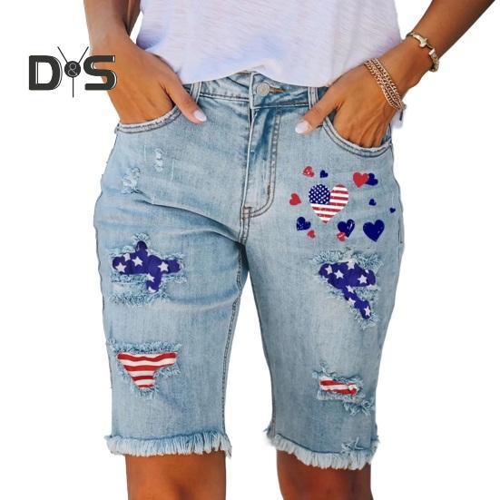 Персонализированный дизайн: Подчеркните свой стиль с помощью этих женских джинсовых шорт с дырочками и принтом «День независимости».. Оставайтесь в тренде с модным и стильным образом, который легко выделяется.