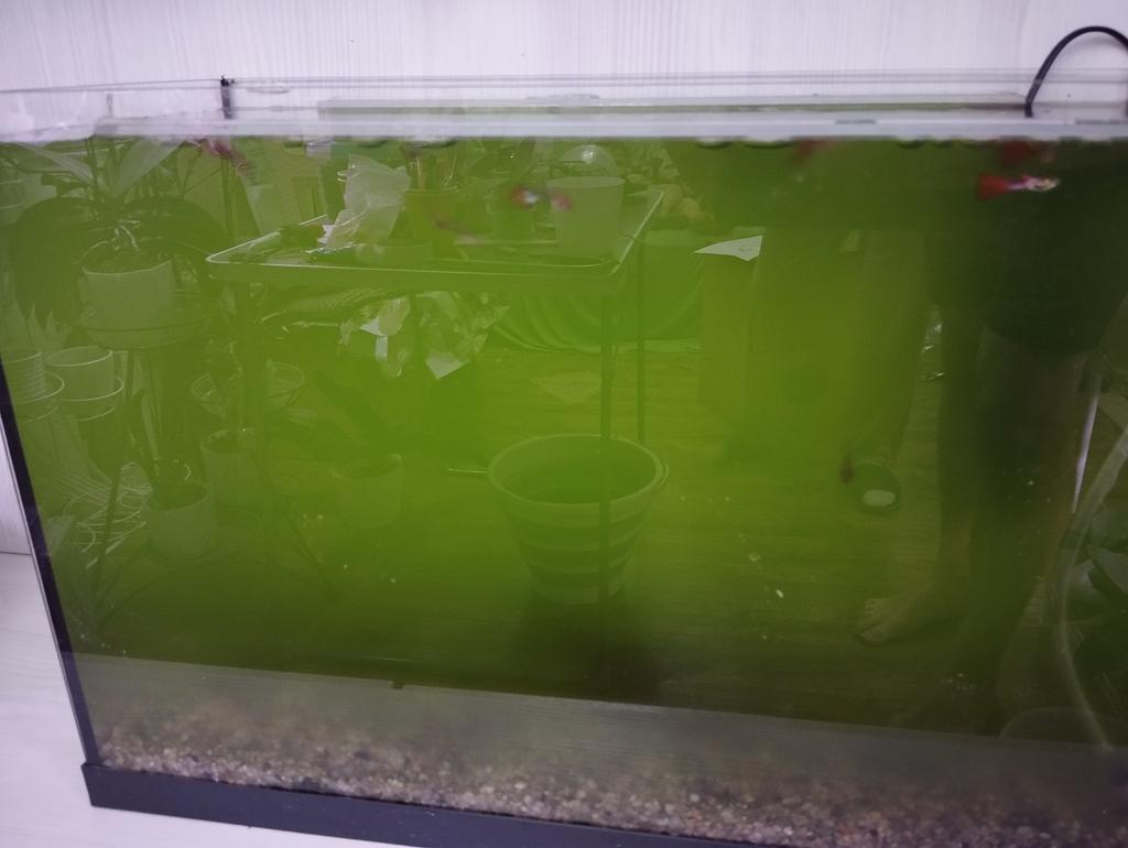 Вода зазеленела. Кристально чистой она не стала. Была немного мутная вода, но после добавления таблеток она сильно позеленела. Аквариум постоял со светом где-то неделю, ничего не изменилось. Пришлось выключить свет, сделали три подмены воды, пока ничего не помогает.