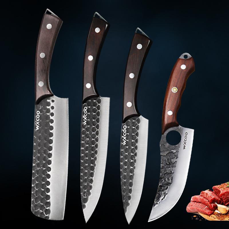 Набор из 4 ножей из нержавеющей стали, кухонные ножи с деревянной ручкой и чехлами, профессиональный нож для разделки мяса, кованый нож, многоцелевой нож для обвалки