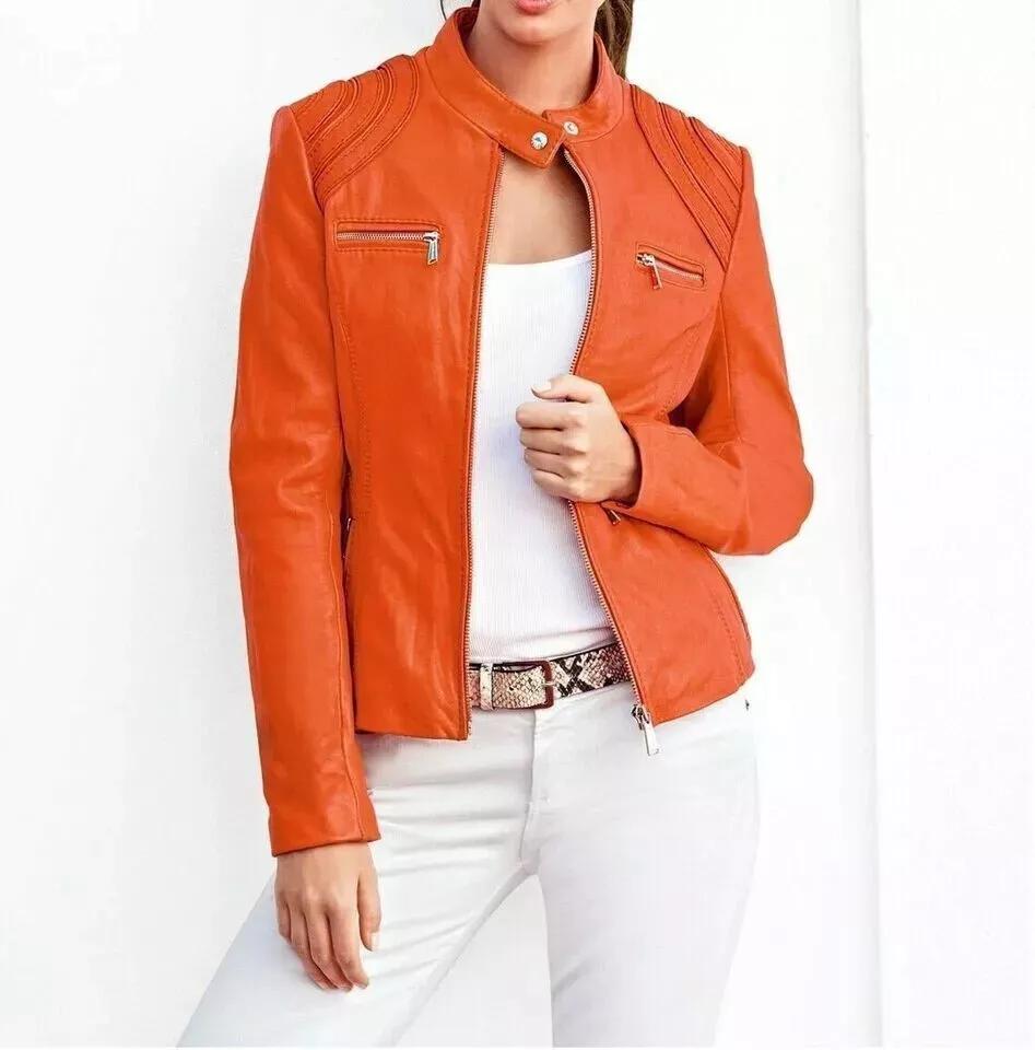 Новая женская куртка оранжевого цвета ручной работы из натуральной кожи ягненка стильная байкерская — купить товар онлайн с бесплатной доставкой по всему миру!
