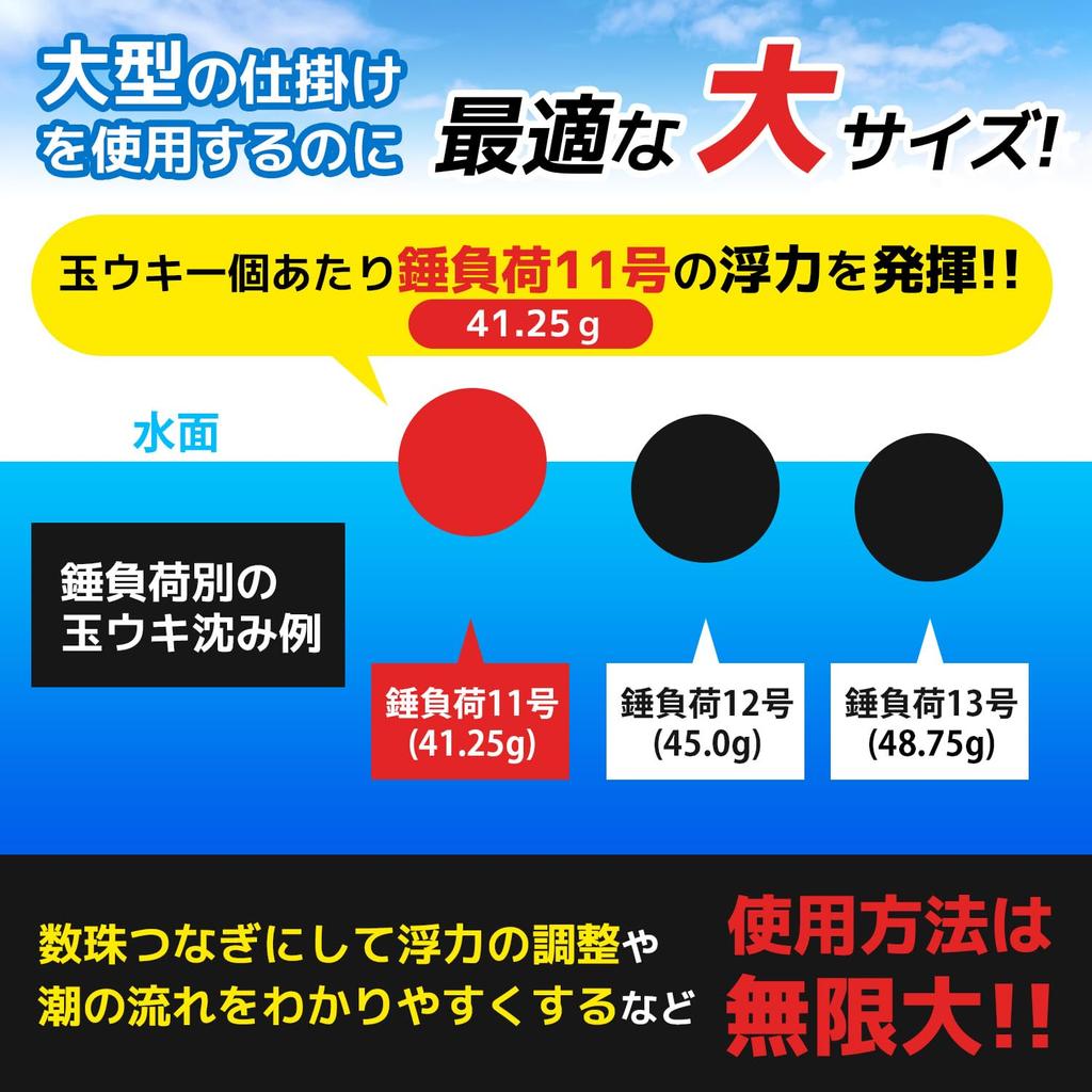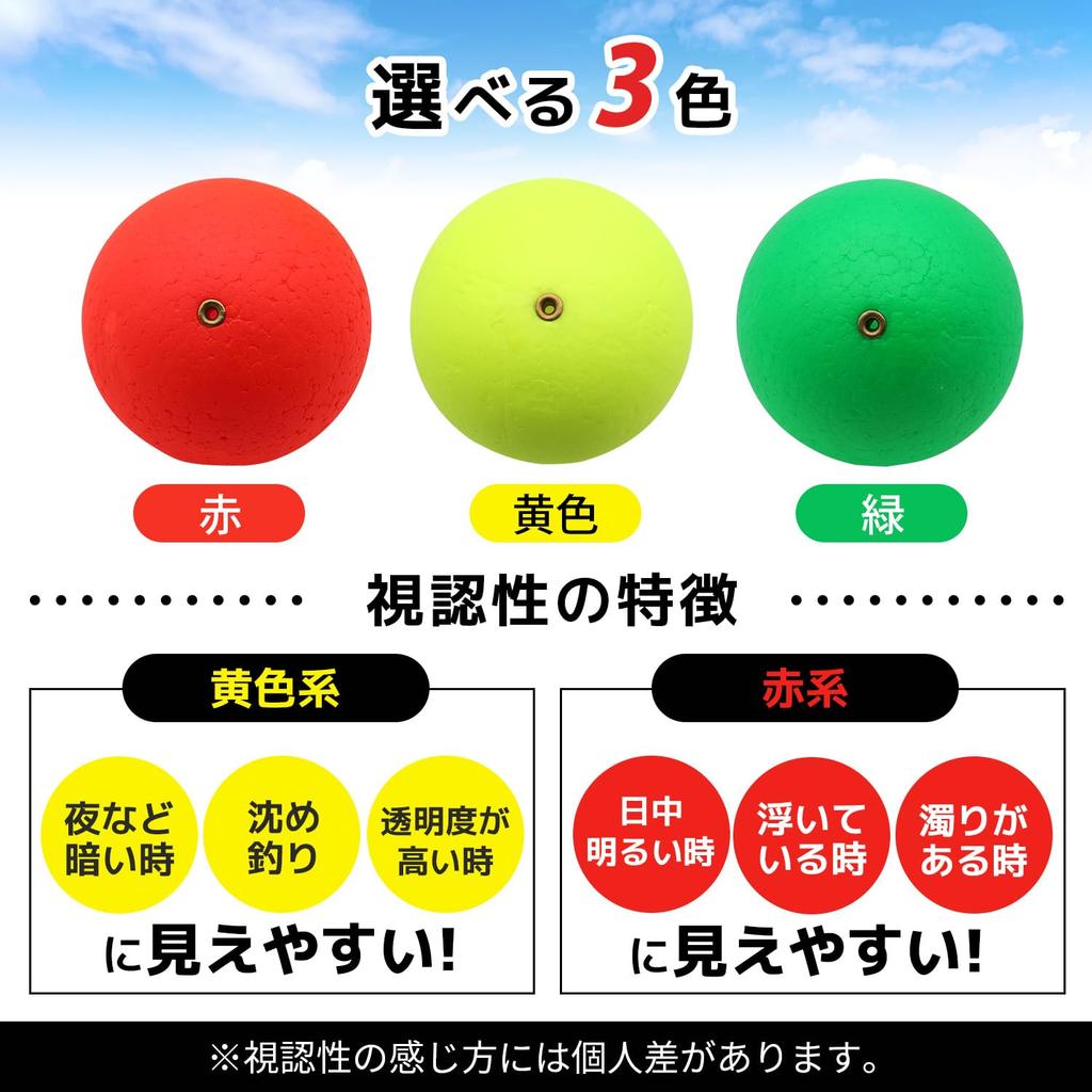 [От профессионалов до любителей] Изысканный баланс легкости и устойчивости. Это надежный поплавок-шар, который может справиться с самыми разными видами рыб, включая ставриду, голубую рыбу и даже кальмаров.. Вы можете насладиться рыбалкой, подходящей для всех видов поплавочной рыбалки, таких как ловля на крючок, ловля на сабики и ловля вплавь.. [Изготовлено из жесткого вспененного материала] Стабильная плавучесть достигается за счет использования жесткого вспененного материала.. Малый вес и высокая прочность позволяют легко обнаружить поклевку и обеспечивают комфортную рыбалку.. [Оснащен полой конструкцией + усиливающее кольцо] Полая конструкция характеризуется тем, что в ней трудно запутаться при броске.. Благодаря прикреплению металлического армирующего кольца к сквозному отверстию, он становится очень прочным и может использоваться в течение длительного времени, предотвращая повреждения при дальних забросах.. [3 цвета с разной видимостью] Зеленый и желтый идеально подходят для ночной рыбалки, подводной рыбалки и очень прозрачной воды.. Красный цвет хорошо виден в яркой среде, например, днем или в мутной воде.. Комбинируя несколько цветов, мы предлагаем цветовые вариации, которые рекомендуют эксперты, выбирающие рыболовные снасти в зависимости от погоды и качества воды.. Хотите сделать первый шаг на пути к тому, чтобы стать экспертом? [Обеспечивает плавучесть, эквивалентную весовой нагрузке Нет. 11 (41,25 г)] Один поплавок-шар обеспечивает плавучесть до No. 11. Связав вместе несколько бусин, вы можете использовать их для различных целей, например, для обеспечения плавучести и определения направления прилива.