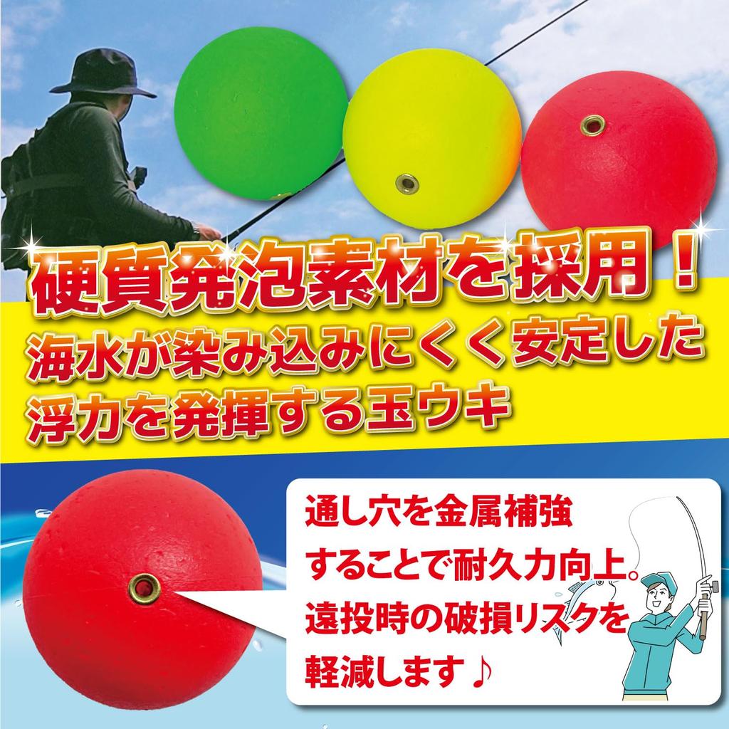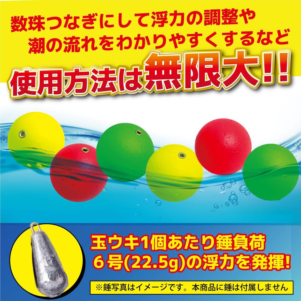 [От профессионалов до любителей] Изысканный баланс легкости и устойчивости. Это надежный поплавок-шар, который может справиться с самыми разными видами рыб, включая ставриду, голубую рыбу и даже кальмаров.. Вы можете заняться рыбалкой, которая подходит под ситуацию, например, ловлей на крючок, ловлей на сабики и ловлей вплавь.. [Изготовлено из жесткого вспененного материала] Стабильная плавучесть достигается за счет использования жесткого вспененного материала.. Малый вес и высокая прочность облегчают эксплуатацию и обнаружение поклевок во время рыбалки.. [Оснащен полой конструкцией + усиливающее кольцо] Полая конструкция характеризуется тем, что в ней трудно запутаться при броске.. Это очень прочное изделие с усиливающим кольцом, прикрепленным к сквозному отверстию, для предотвращения повреждений при дальних забросах.. [3 цвета с разной видимостью] Зеленый и желтый идеально подходят для ночной рыбалки, подводной рыбалки и очень прозрачной воды.. Красный цвет хорошо виден в яркой среде, например, днем или в мутной воде.. Цветовые вариации также рекомендуются экспертам, которые выбирают рыболовные снасти в зависимости от погоды и качества воды, комбинируя несколько цветов.. [Обеспечивает плавучесть, эквивалентную весовой нагрузке Нет. 6 (22,5 г)] Один поплавок-шар обеспечивает плавучесть до No. 6. Соединив несколько бусин вместе, его можно использовать по-разному, например, для измерения плавучести и определения течения прилива.. *Он утонет с Нет. 7 вес (Проверить)