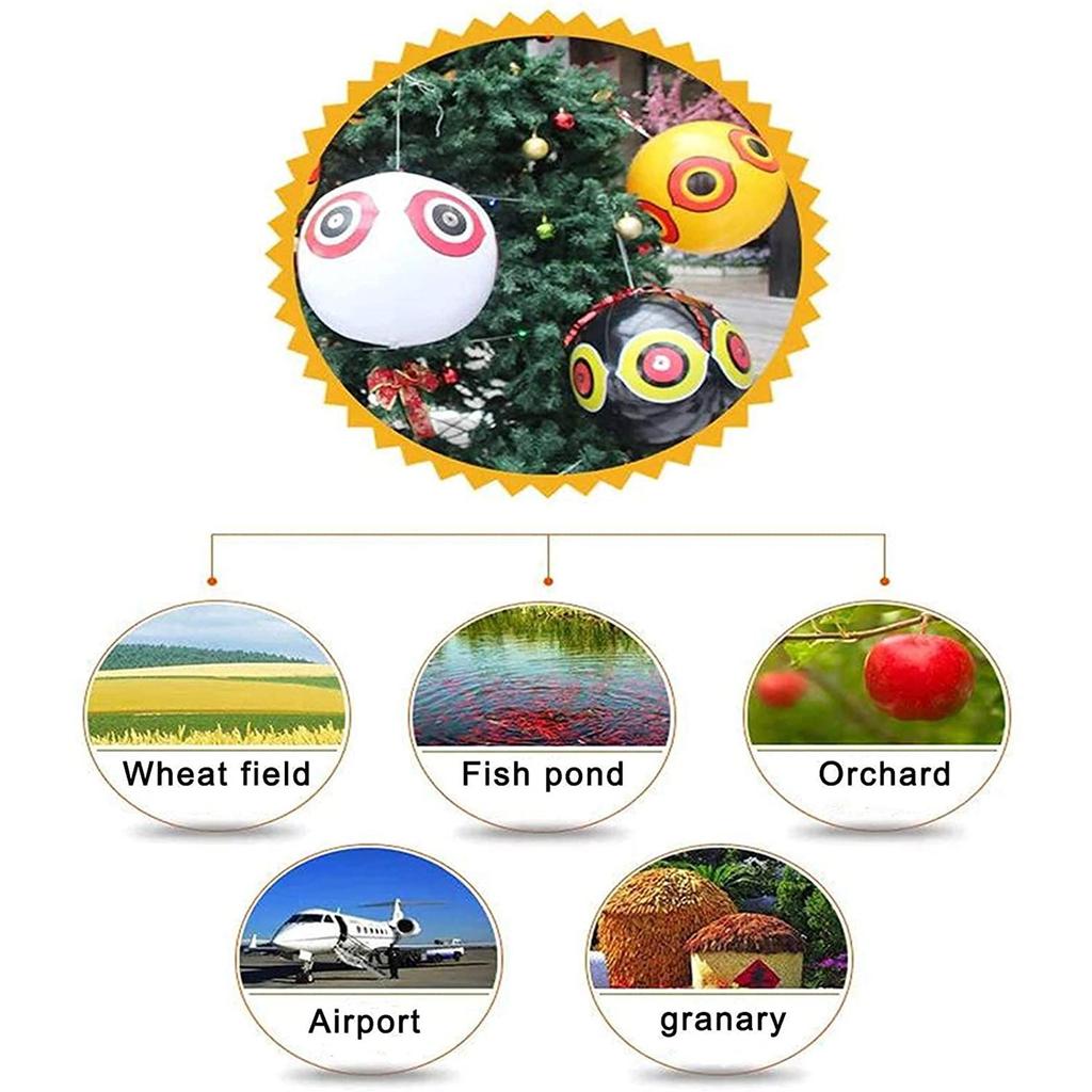 Вам просто нужно надуть и повесить его на ветку дерева или в любое место, где вы хотите защититься от влияния птиц, большие страшные глаза в сочетании с цветами легко отпугнут большинство птиц.. Надуйте и повесьте средство отпугивания птиц на деревьях, сельскохозяйственных культурах и уязвимых участках садов и зданий от повреждений птицами.