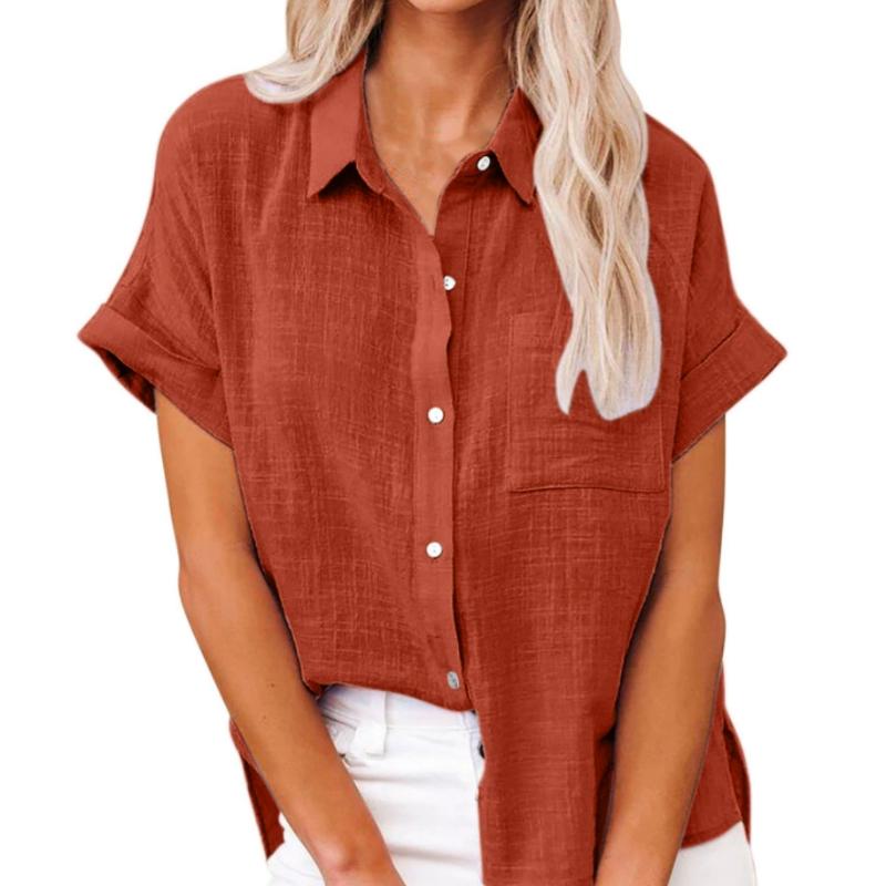 Однотонная рубашка из хлопка и льна с коротким рукавом, повседневная свободная рубашка