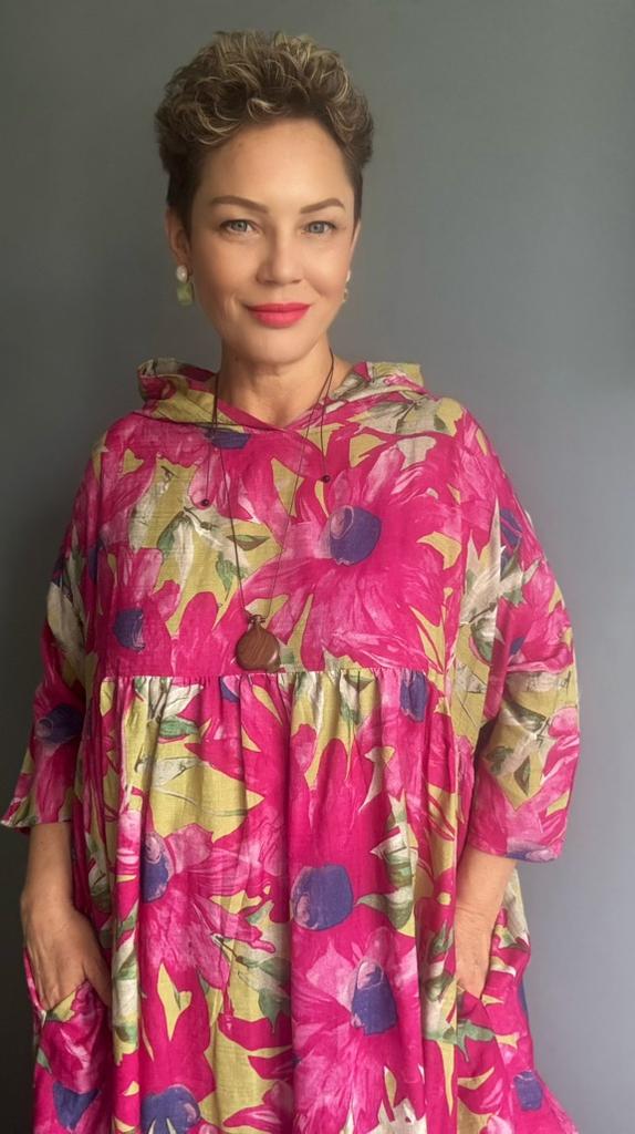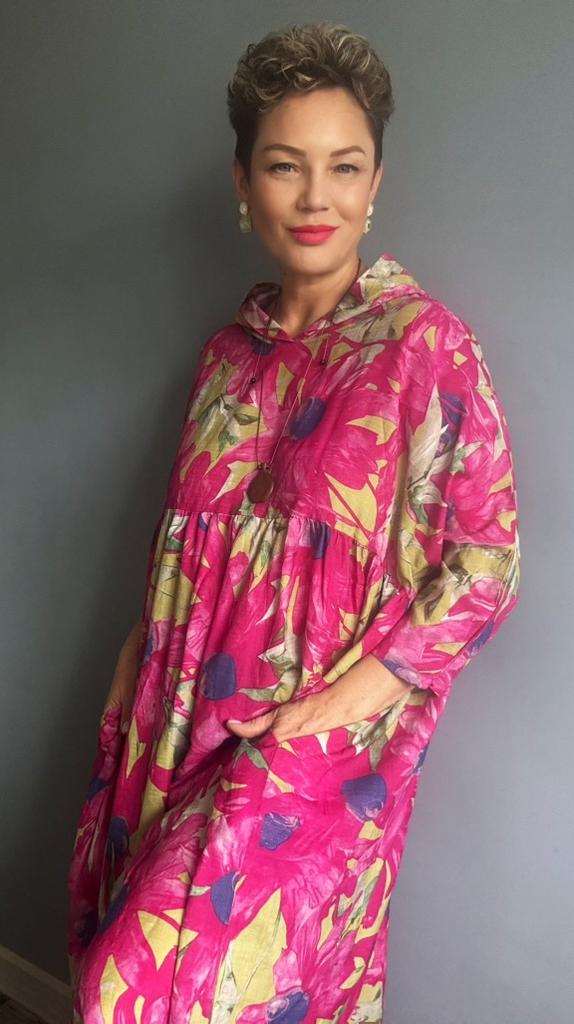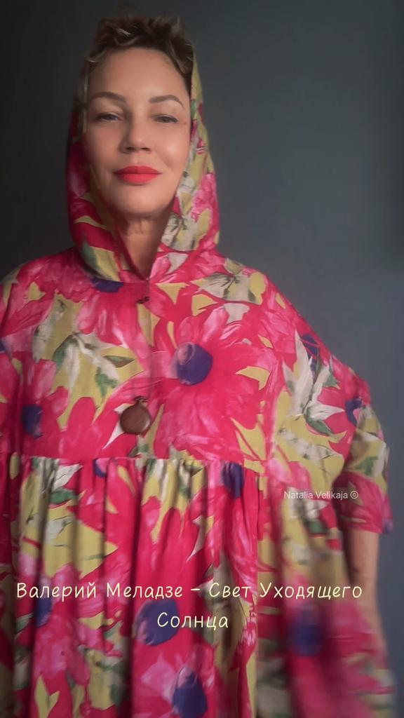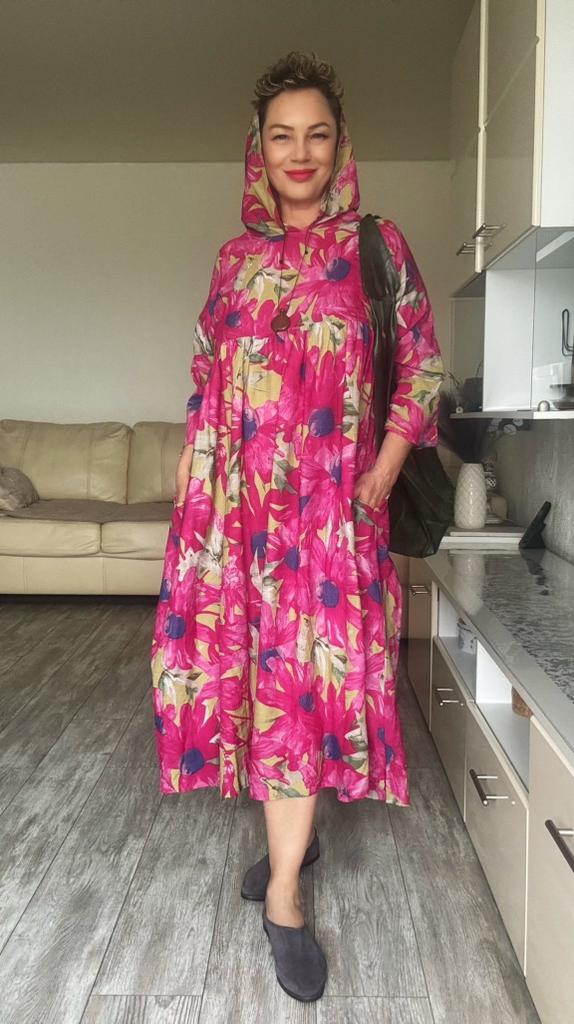 Платье очень понравилось. Натуральный хлопок. Расцветка солнечная ,шикарная. Балахон. Мне немного не хватает длинны и капюшон маленький. Но доставка больше двух месяцев. Уже не поносить в этом году. Жаль.