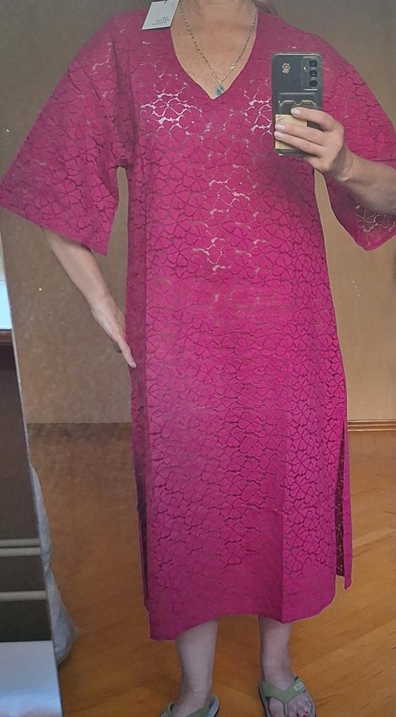 Получила и в замешательстве. Маленько другое ожидала, думала платье, хотя и написано, что кафтан. Это объемная вещь, без вытачек и подклада, надо одевать на что-то. Заказывала р-р М, мой рост 171, ОБ и ОГ 102. Смотрите сами. Ткань хорошая, хлопок с полиамид.