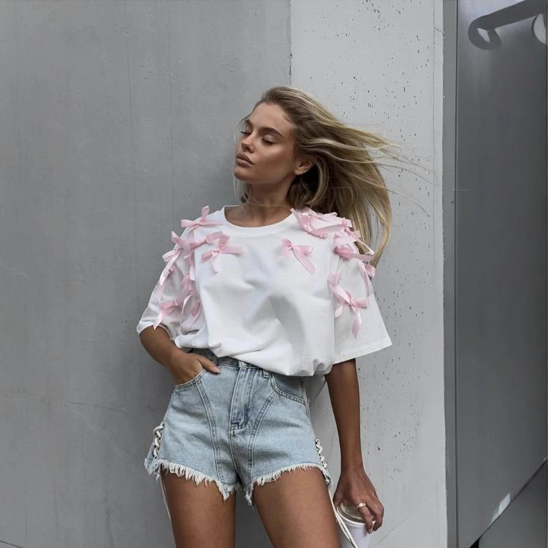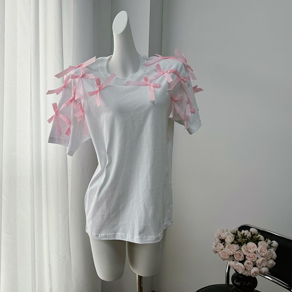 Женский летний милый девичий свободный повседневный топ с коротким рукавом и бантом из ленты