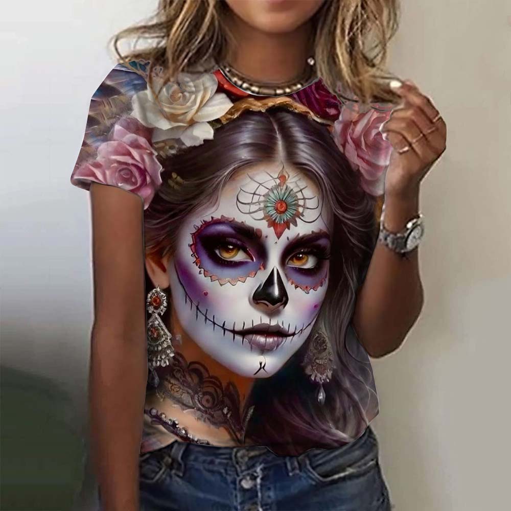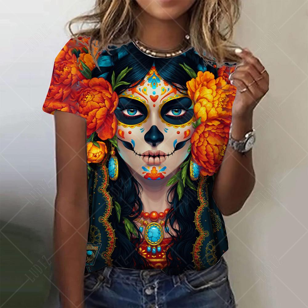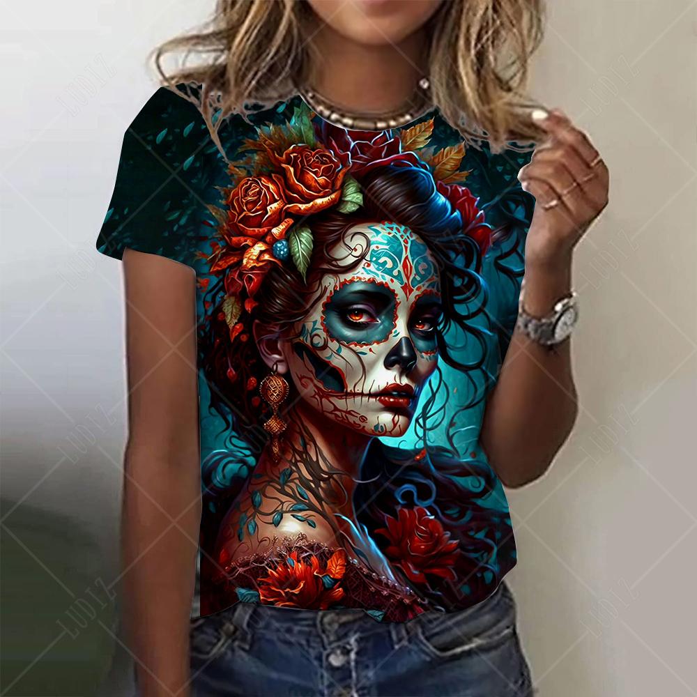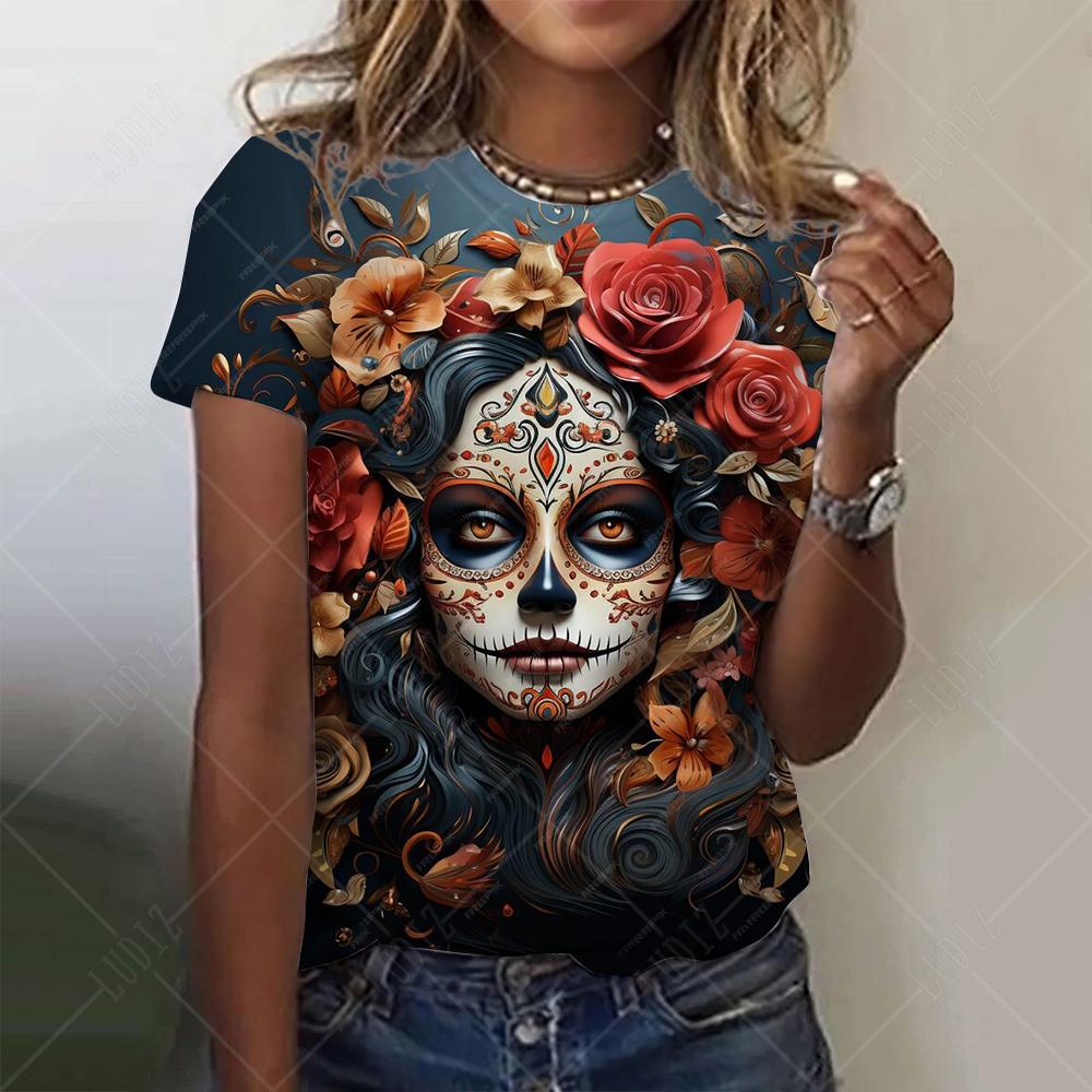 Мексиканская женская футболка «День мертвых» с 3D принтом «Роза Катрина Богиня» и круглым вырезом, футболки с короткими рукавами, уличная одежда Y2k, одежда для девочек