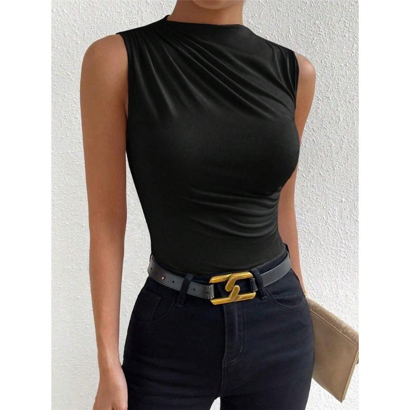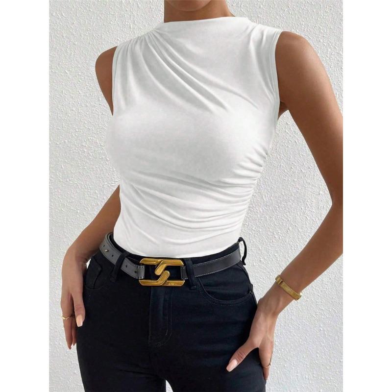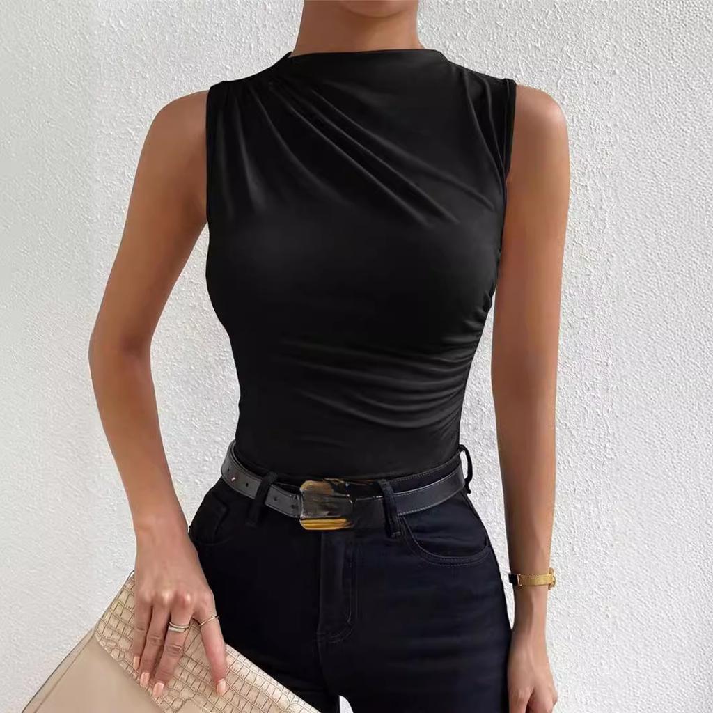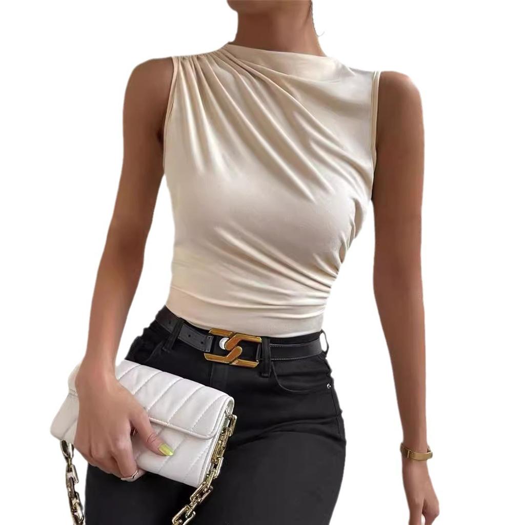 Женская весенне-летняя модная универсальная однотонная плиссированная футболка с полувысоким воротом