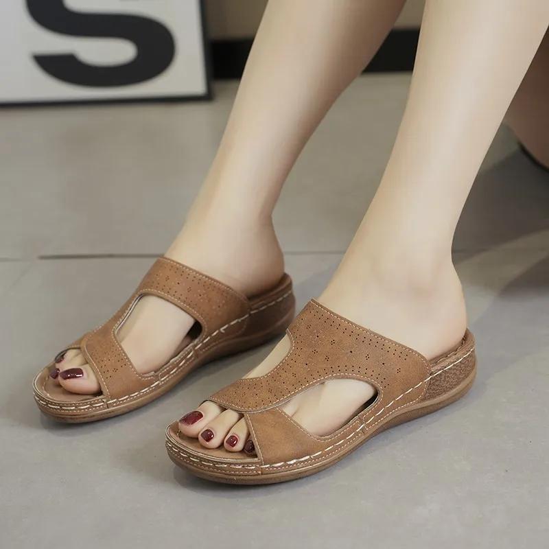 Летние женские тапочки на танкетке, новые ретро-ботинки с открытым носком и поддержкой свода стопы, ортопедические женские сандалии на платформе, повседневная пляжная обувь для отдыха на природе