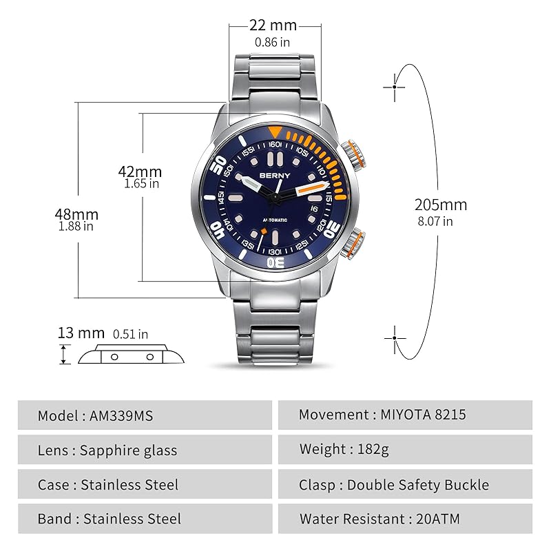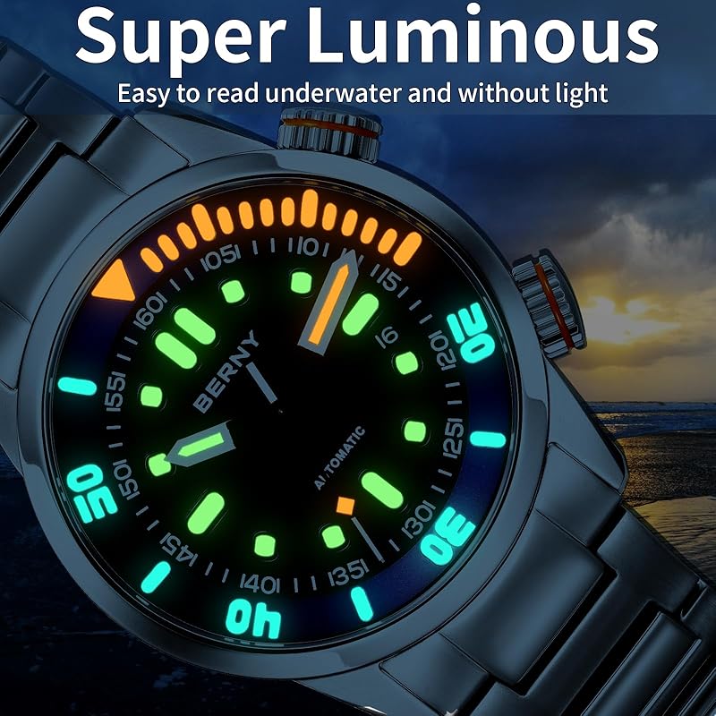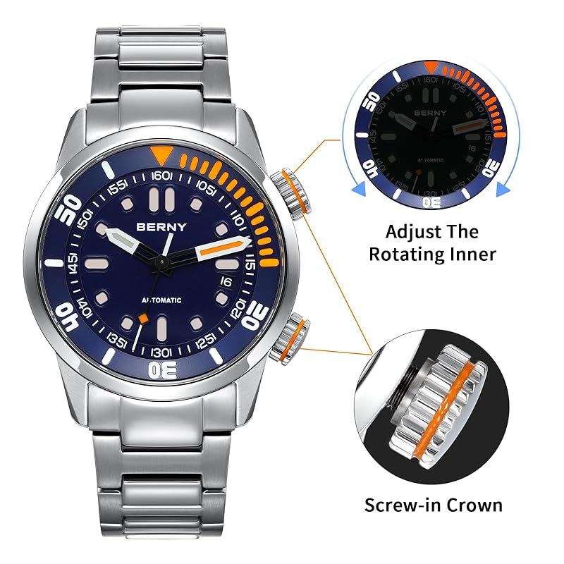 ВОДОНЕПРОНИЦАЕМОСТЬ: Часы для дайвинга BERNY специально разработаны для любителей водных видов спорта и повышают эффективность погружений за счет эффективной изоляции от воды. Водонепроницаемость достигает 20 АТМ. (200 метров) и может легко заниматься плаванием и дайвингом.