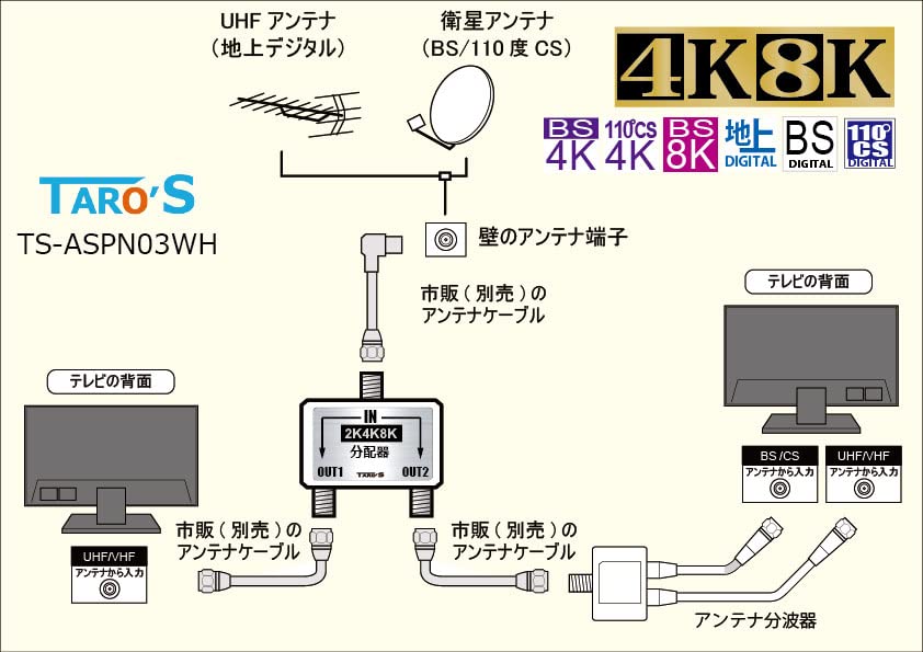 Это разветвитель, который распределяет антенные радиоволны на два телевизора в формате 4K8K, наземного цифрового вещания, BS и CS.