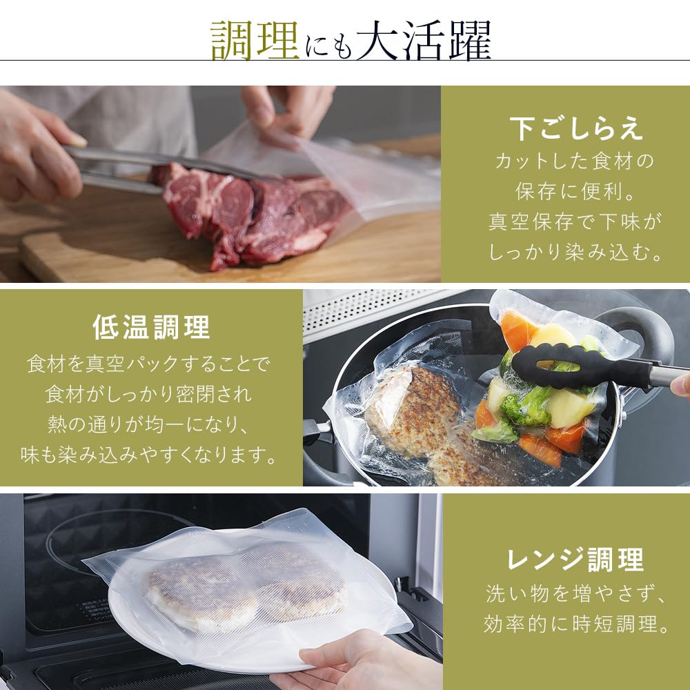 - [Отлично подходит для приготовления пищи] - Подготовка: Удобно для хранения нарезанных ингредиентов. При добавлении приправ храните их в вакууме, чтобы аромат впитался.. ・Вакуумная готовка: Предотвращает неравномерный нагрев и делает пищу пышной и сочной.. Сохраняет вкус и питательные вещества. ・Приготовление в микроволновой печи: Вакуумные пакеты можно использовать в микроволновой печи.. Эффективно экономьте время и готовьте, не увеличивая количество посуды, которую нужно мыть.
