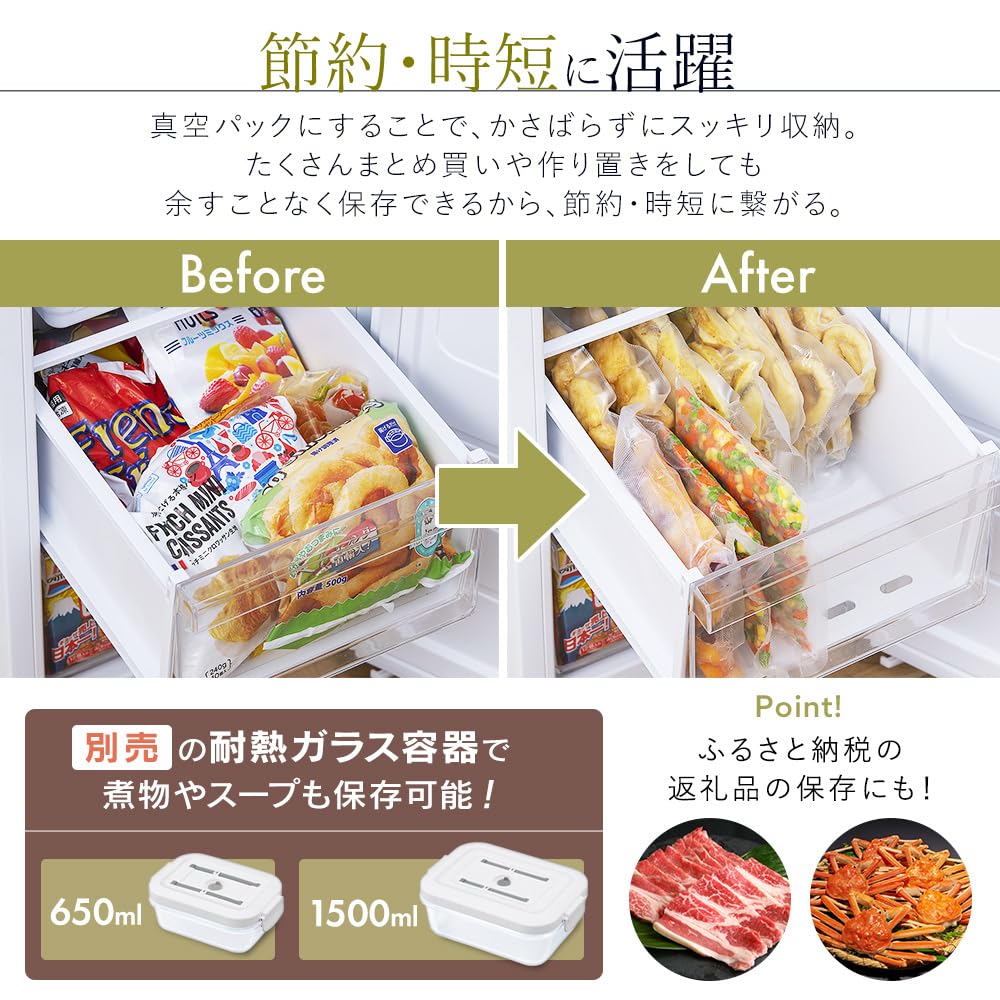 ・[Быстрый вакуум] Создает сильный вакуум с максимальной силой дегазации около 60 кПа. Одновременная уборка пылесосом также не вызывает стресса. Вы можете хранить различные ингредиенты и остатки ингредиентов, чтобы поддерживать чистоту и порядок в морозильной камере и холодильнике.. Поскольку он герметичен, он также предотвращает передачу запахов пищи.. Его также можно использовать в качестве герметика для хранения сладостей, которые нельзя съесть сразу.