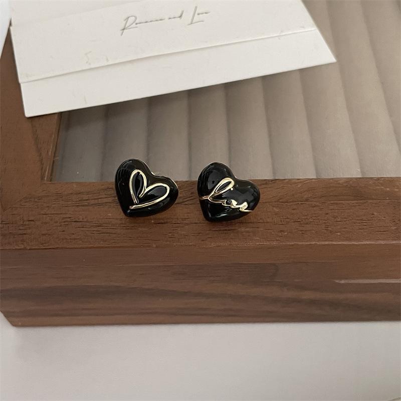 Милые черные эмалевые серьги-гвоздики в форме сердца для женщин и девочек, асимметричные серьги в форме сердца с буквами Love, модные ювелирные изделия