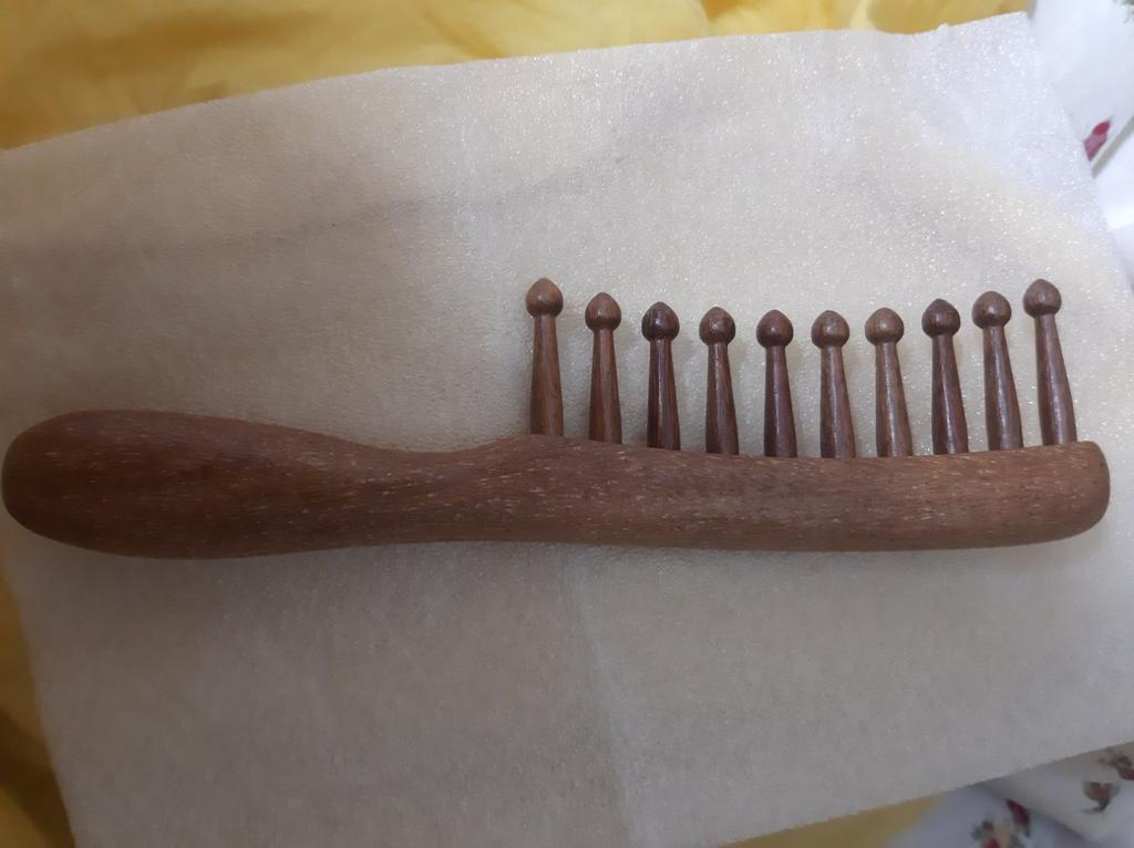 Древесный запах... Не очень тяжелая, и не очень большая... сравниваю с другими деревяными сандаловыми расческами... удобно держать в руке.