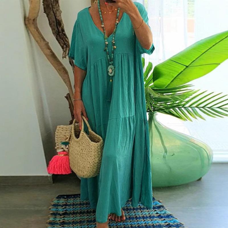 Почувствуйте непринужденный летний стиль с этим макси-платьем в стиле бохо-шик! Это платье свободного кроя с жатой текстурой, созданное для удобства и универсальности, имеет круглый вырез и струящийся силуэт. Оно идеально подходит для повседневных прогулок, пляжных дней или приключений на выходных.. Изготовлен из легкой, дышащей ткани, сохраняет прохладу и привносит нотку художественного изящества в ваш гардероб..