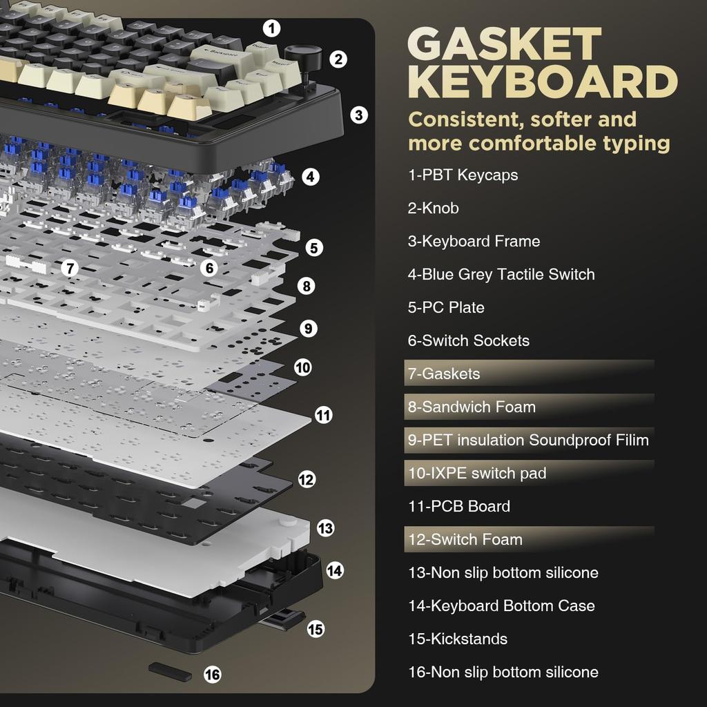 ・Конструкция с прокладкой и прочными клавишами: Кремовая клавиатура B75 использует премиальное крепление на прокладках для обеспечения мягкого, но отзывчивого ощущения нажатия клавиш, снижая нагрузку даже при длительном использовании.. Многослойная подкладка из пены высокой плотности гасит звук и вибрацию, обеспечивая тихую, комфортную и мягкую клавиатуру.. Прочные двухкомпонентные колпачки клавиш из ПБТ устойчивы к износу и разрывам, обеспечивая длительную работу для пользователей, которым важен как стиль, так и функциональность.