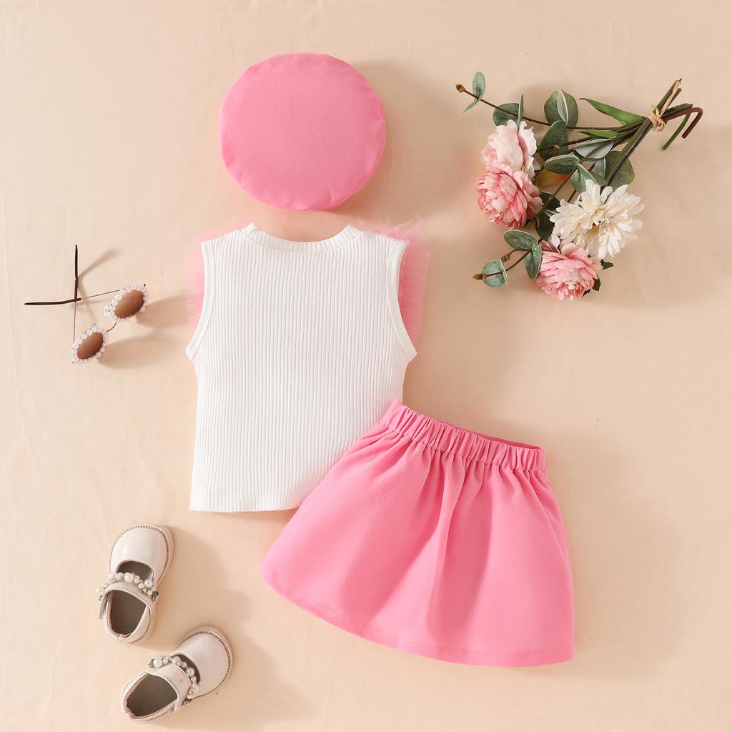Повседневный модный комплект для девочек, летний детский милый топ без рукавов + юбка с бантом + берет, комплект из трех предметов
