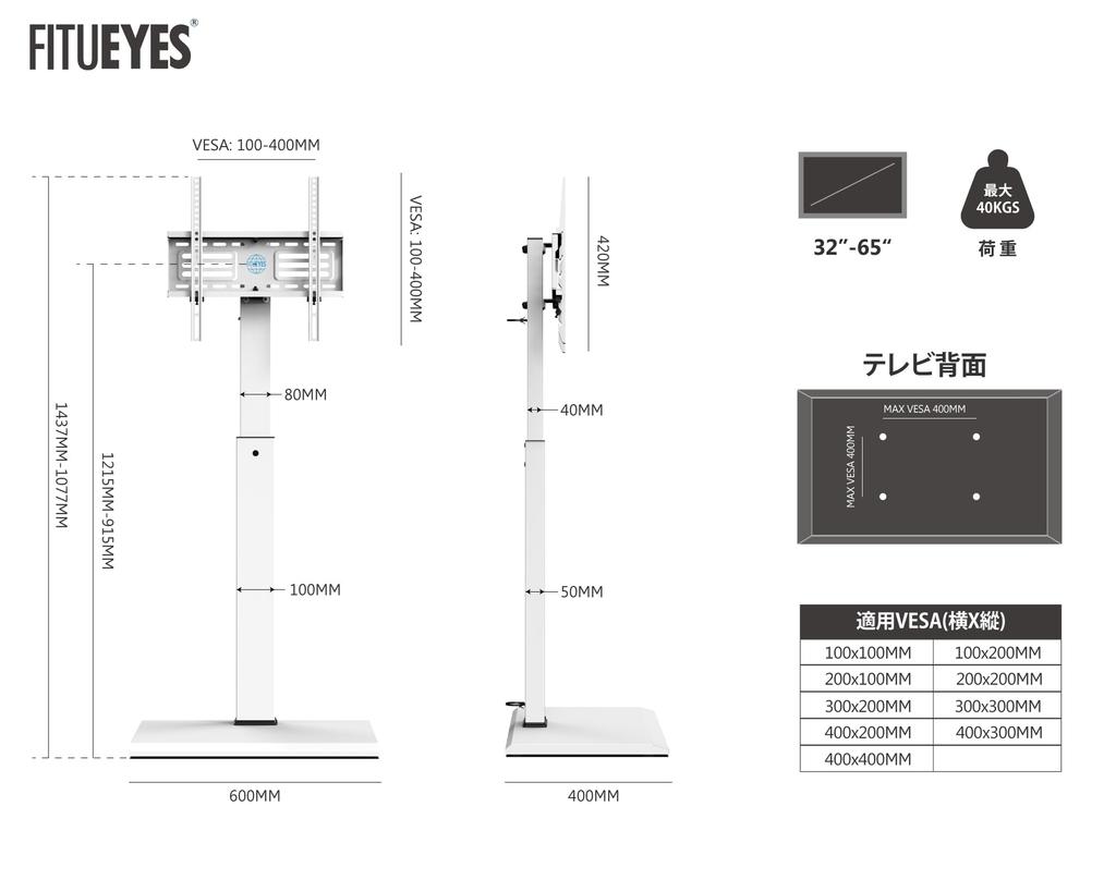 Мы всегда ищем лучшие способы сделать просмотр более комфортным и приятным.. С первых отдельных функций он начал играть роль в планах систем, интегрированных в современный образ жизни.. Выбор материалов, проектирование конструкции и выражение внешней формы основаны на наших фундаментальных убеждениях, и мы превращаем функциональные продукты в художественные выражения.. FITUEYES придерживается строгих стандартов мастерства и рассматривает детали наших изделий взглядом художника.. FITUEYES — это не только бренд, который предпочитают пользователи по всему миру, но и образ жизни, который будет определять будущее.. [Совместимость со стандартами VESA] Совместимость с универсальным стандартом VESA (расстояние между отверстиями для винтов на задней панели телевизора), минимальный размер 10 x 10 см, максимальный 40 x 40 см. Этот продукт совместим с телевизорами и мониторами с диагональю 32–55 дюймов.. [Вращение стойки/регулировка высоты] Вы можете выбрать и установить стойку на 8 различных высотах. (1216 мм до 1426 мм) в зависимости от места установки металлической фурнитуры и опоры. Идеально соответствует требованиям к высоте телевизора для пользователей разного роста, обеспечивая удобное и комфортное визуальное наслаждение.. Кроме того, его можно поворачивать на ±30° влево и вправо, что позволяет добиться оптимального угла регулировки.