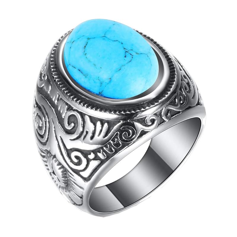 Oakky men's stainless steel Silver black oval turquoise inlay ring blue size 19