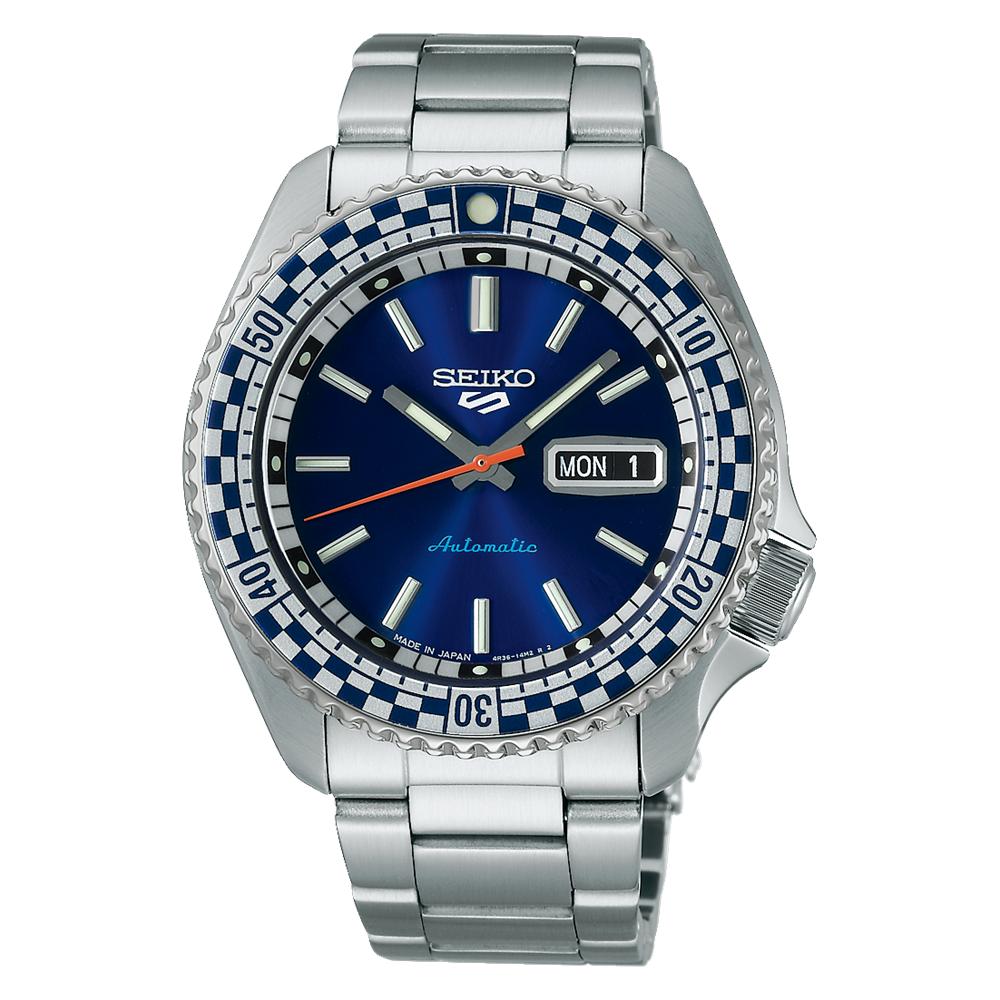 Часы имеют корпус из нержавеющей стали круглой формы диаметром 42,5 мм и толщиной 13,4 мм.. Корпус рассчитан на повседневную носку и обеспечивает долговечность.. Циферблат часов Seiko 5 Sports ярко-синего цвета, что подчеркивает их визуальную привлекательность.