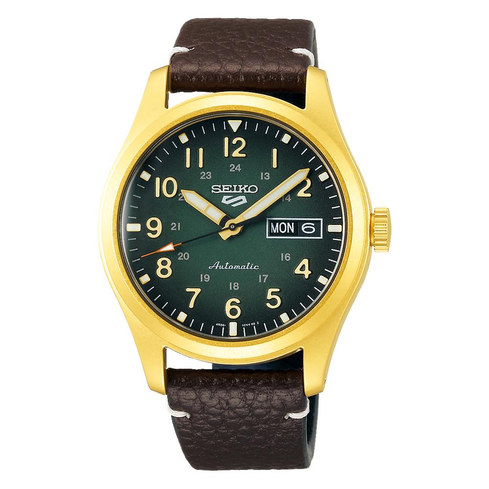 Часы имеют корпус из нержавеющей стали с золотым покрытием, который имеет круглую форму.. Благодаря диаметру 39,4 мм и толщине 13,2 мм, он удобно сидит на запястье.. Циферблат Seiko 5 — поразительного зеленого цвета, что повышает его визуальную привлекательность.