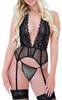 Siyah Lame Deri Tül Detaylı File Çoraplı Jartiyer Takım Gecelik