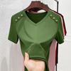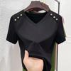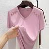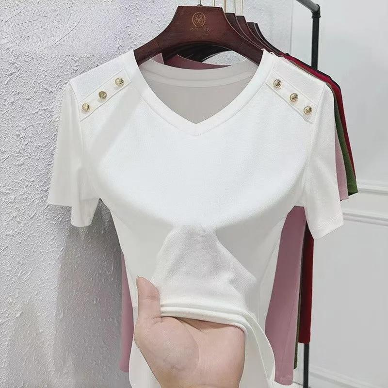 Женская футболка свободного кроя белого цвета с V-образным вырезом — корейский стиль, короткие рукава, чистый хлопок, модная и универсальная для лета 2024 года.