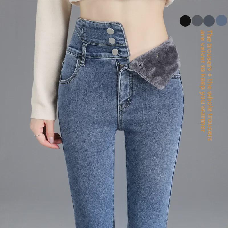 Женские джинсы с высокой посадкой в корейском стиле с плюшем - Эластичный деним облегающего кроя для осени и зимы 2022
