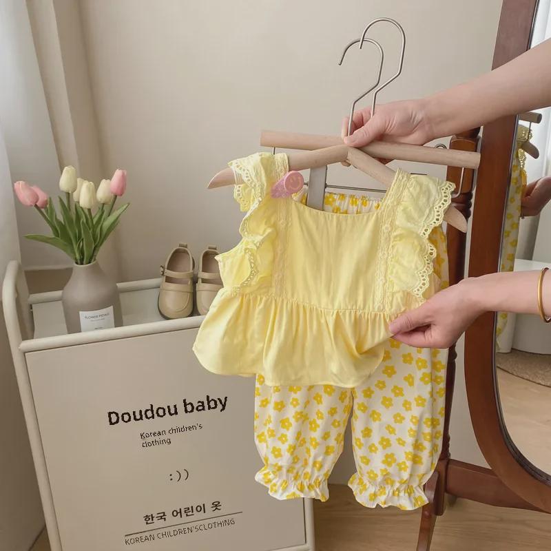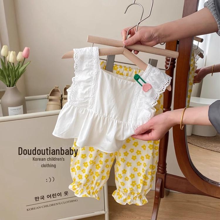 Летний комплект из двух частей для девочек 2024 г.: Топы и брюки без рукавов с квадратным воротником для детей маленьких/средних размеров