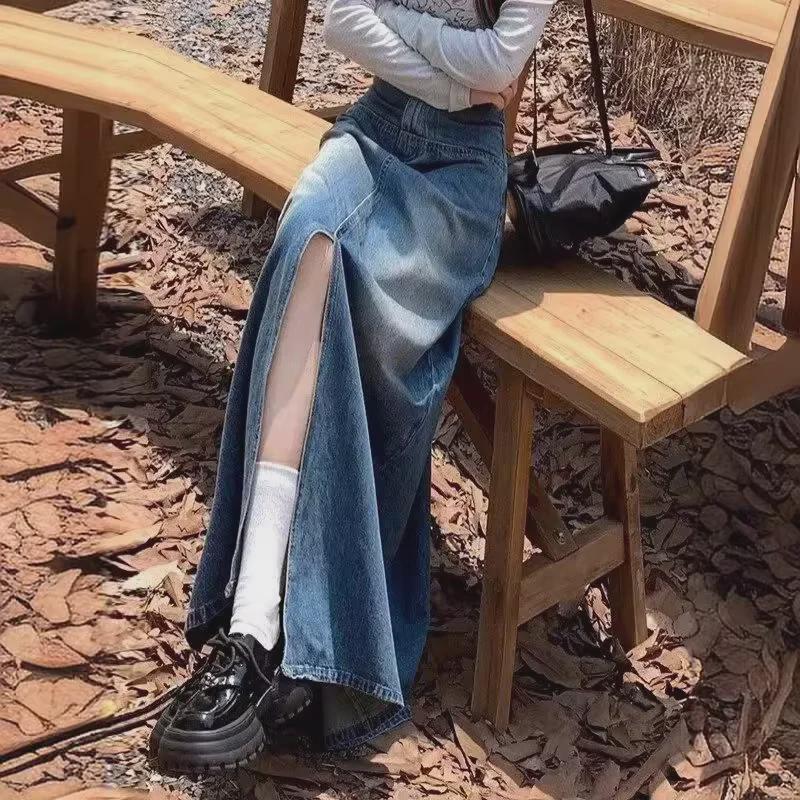 Женская джинсовая юбка А-силуэта с высокой талией и разрезом в стиле ретро, весна-лето