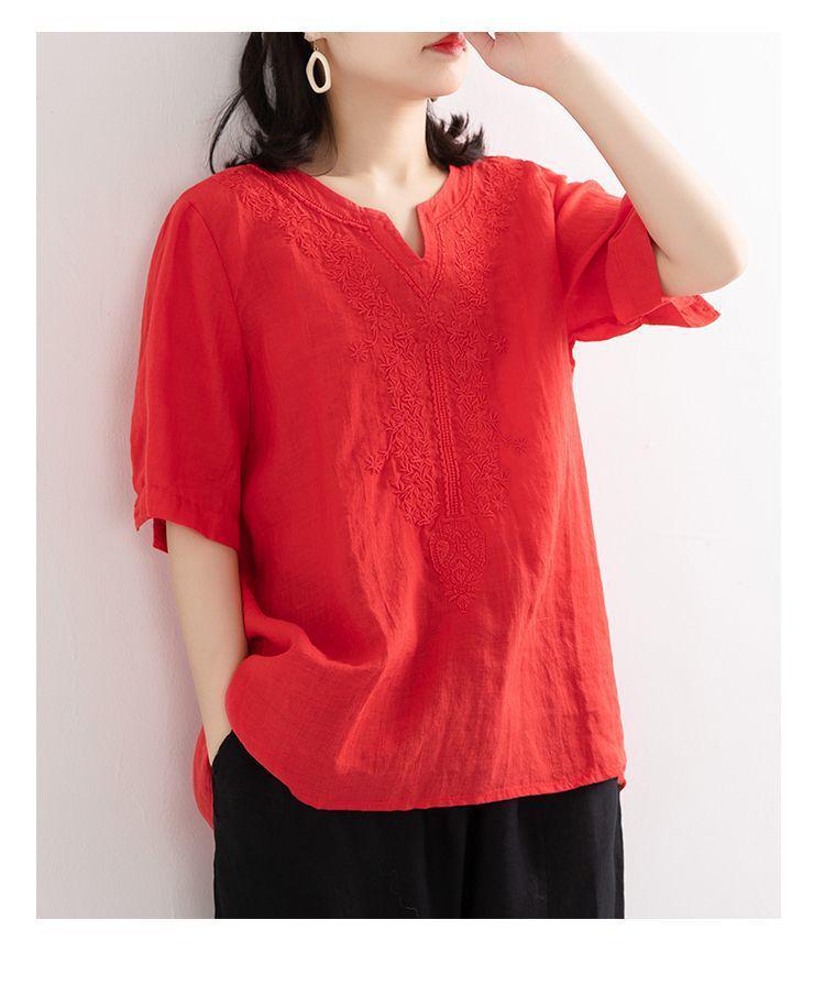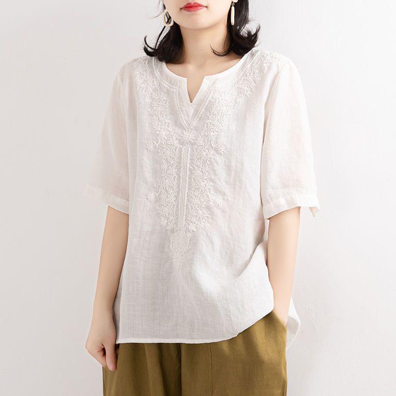 Женская вышитая рубашка-пуловер из хлопка и льна с V-образным вырезом и короткими рукавами