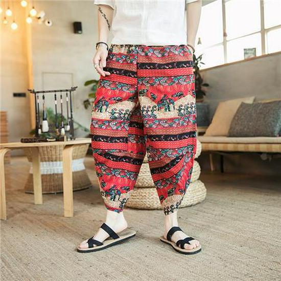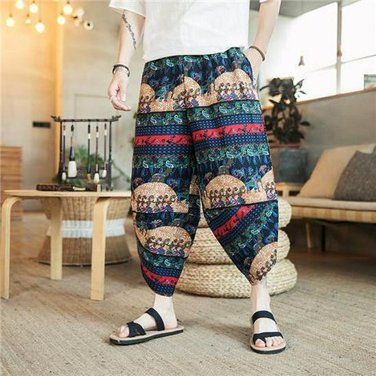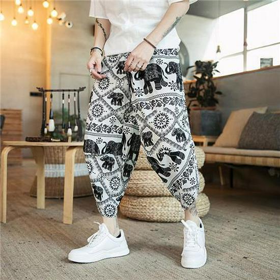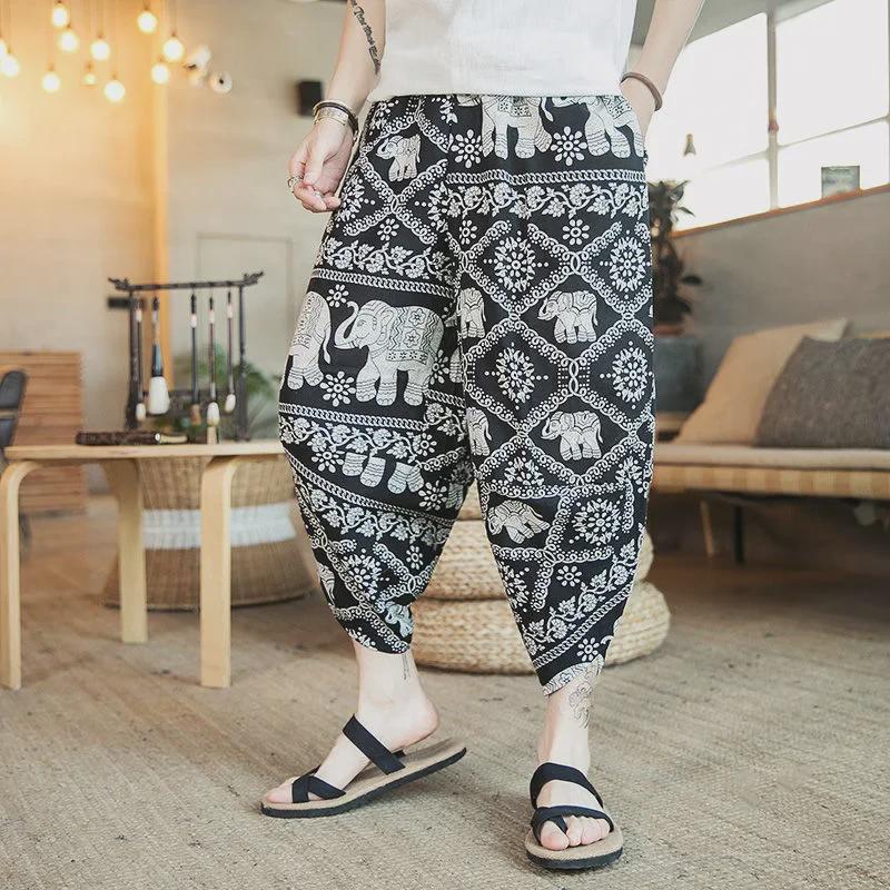 Мужские широкие шаровары из хлопка и льна с этническим тайским слоном – повседневные брюки с цветочным узором Nine-Point