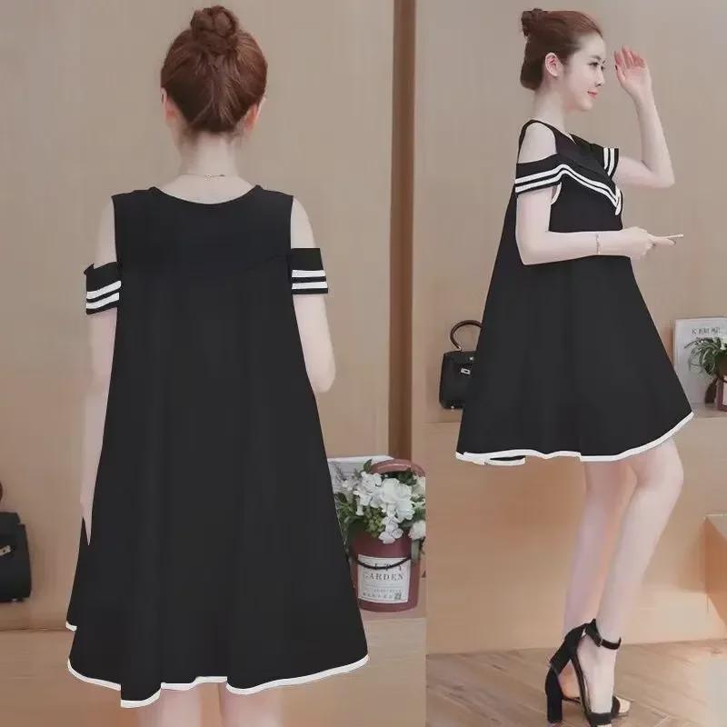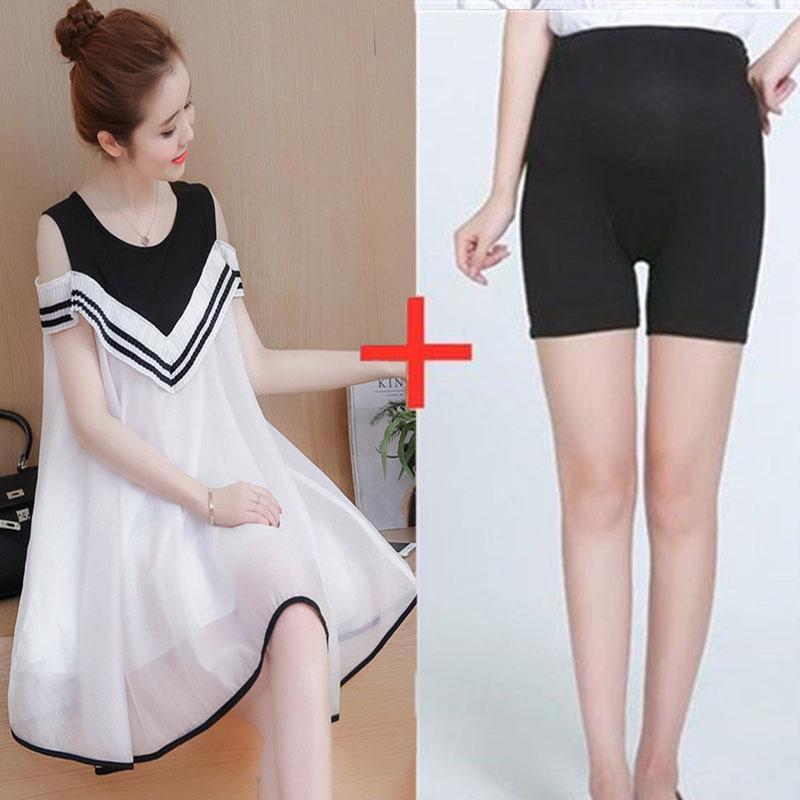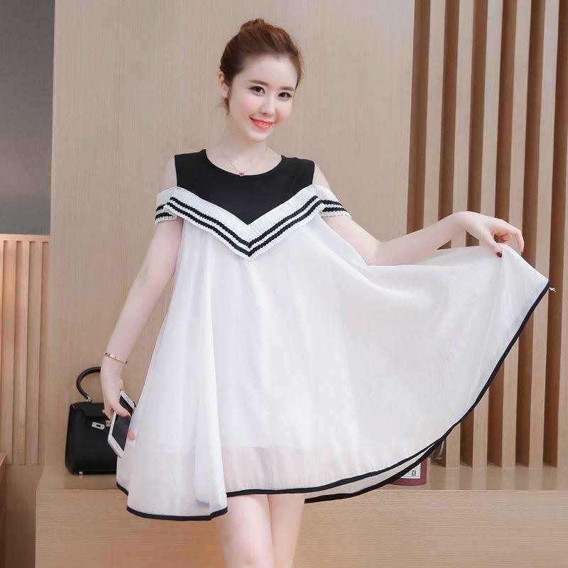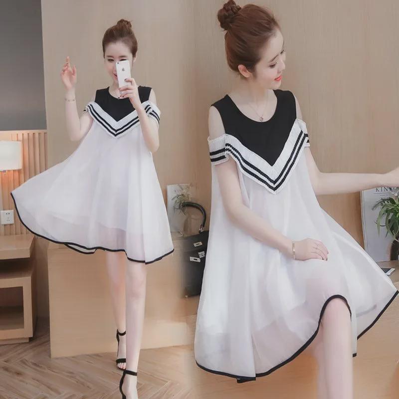 Летнее платье для беременных в корейском стиле с открытыми плечами и юбкой средней длины из шифона