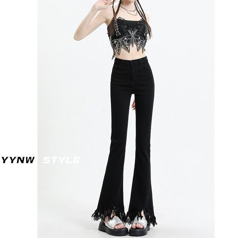 Женские черные расклешенные джинсы с высокой талией - весна/осень 2024 г., эластичный узкий крой с необработанным краем — купить товар онлайн с бесплатной доставкой по всему миру!