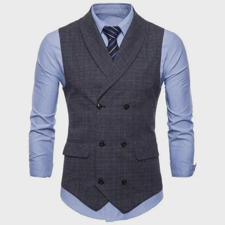 Мужской двубортный жилет в клетку на весну и осень — корейский приталенный крой