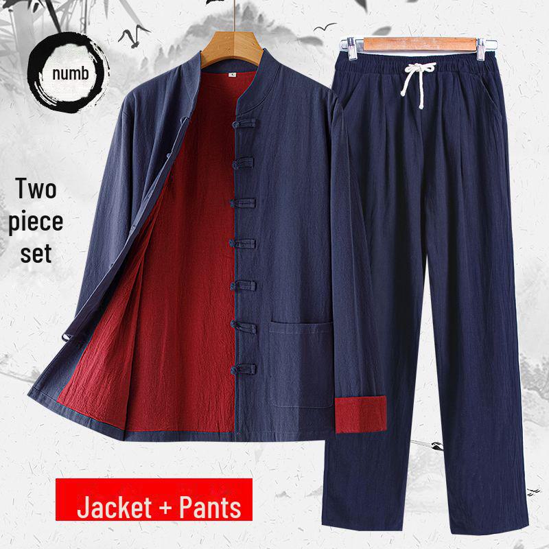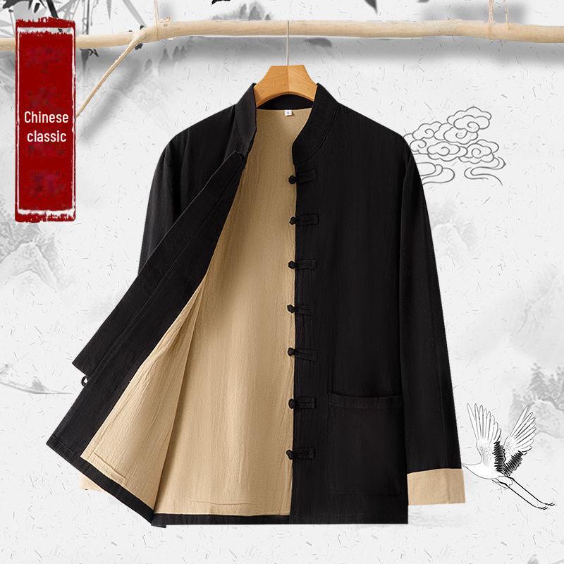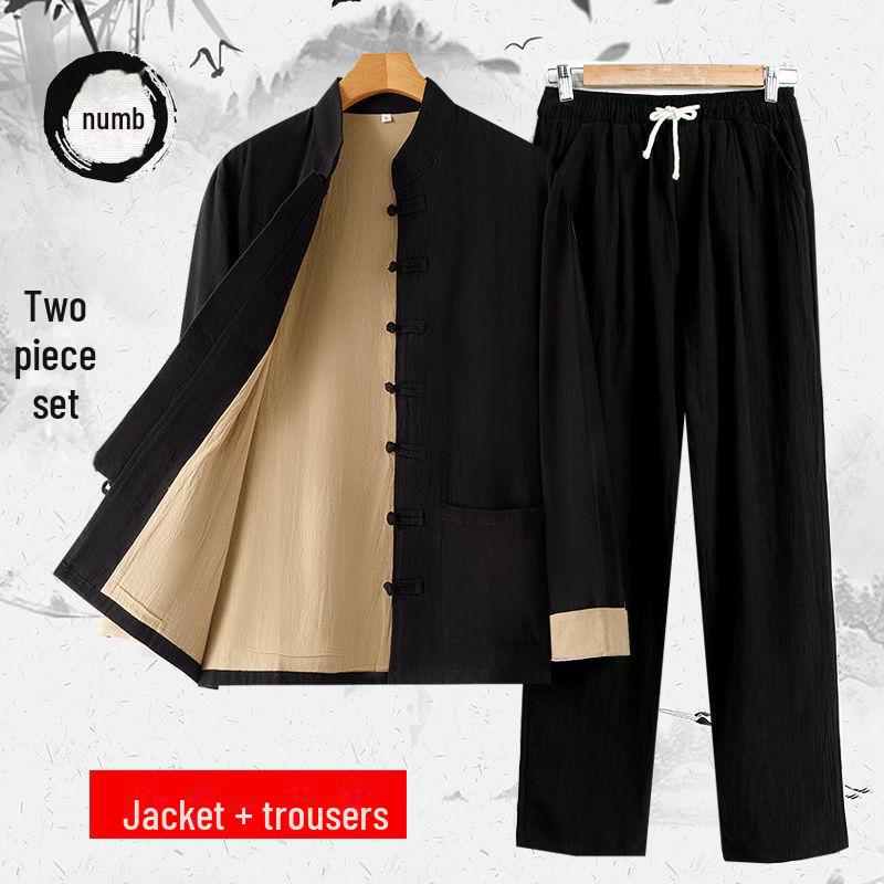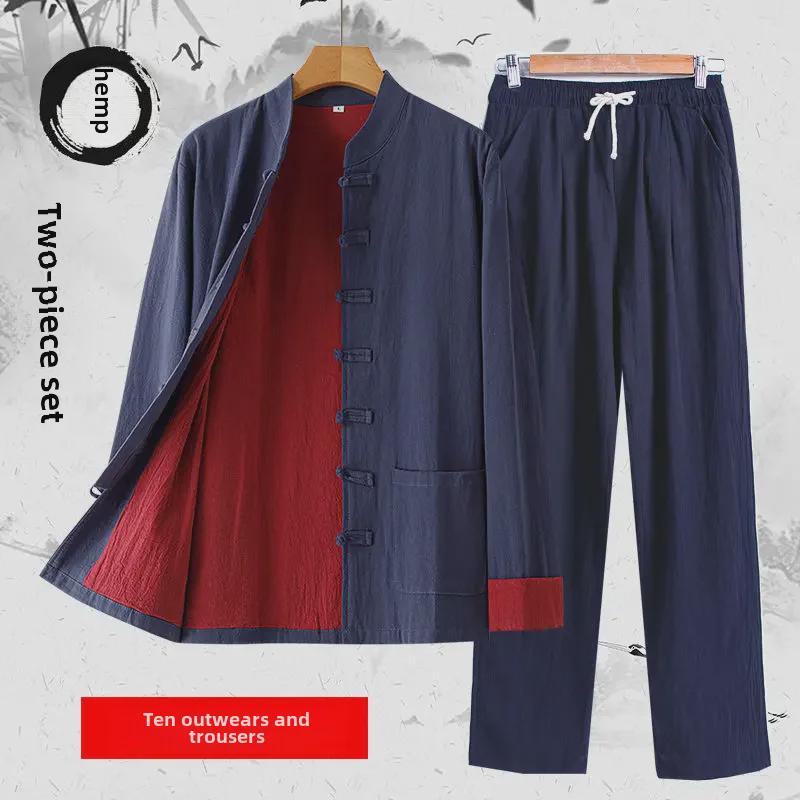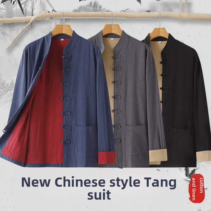 Мужской костюм Тан из хлопка и льна с длинными рукавами — ретро-китайский стиль для людей среднего и пожилого возраста на осень