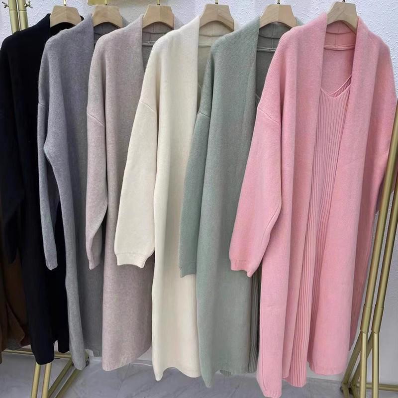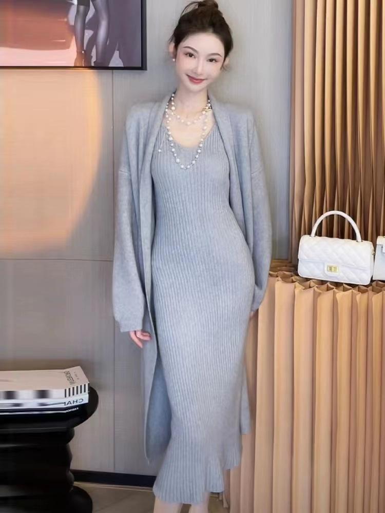 Женский комплект из двух предметов: трикотажное платье и свитер-кардиган осень/зима 2024 года — средняя и длинная модель в стиле Lazy