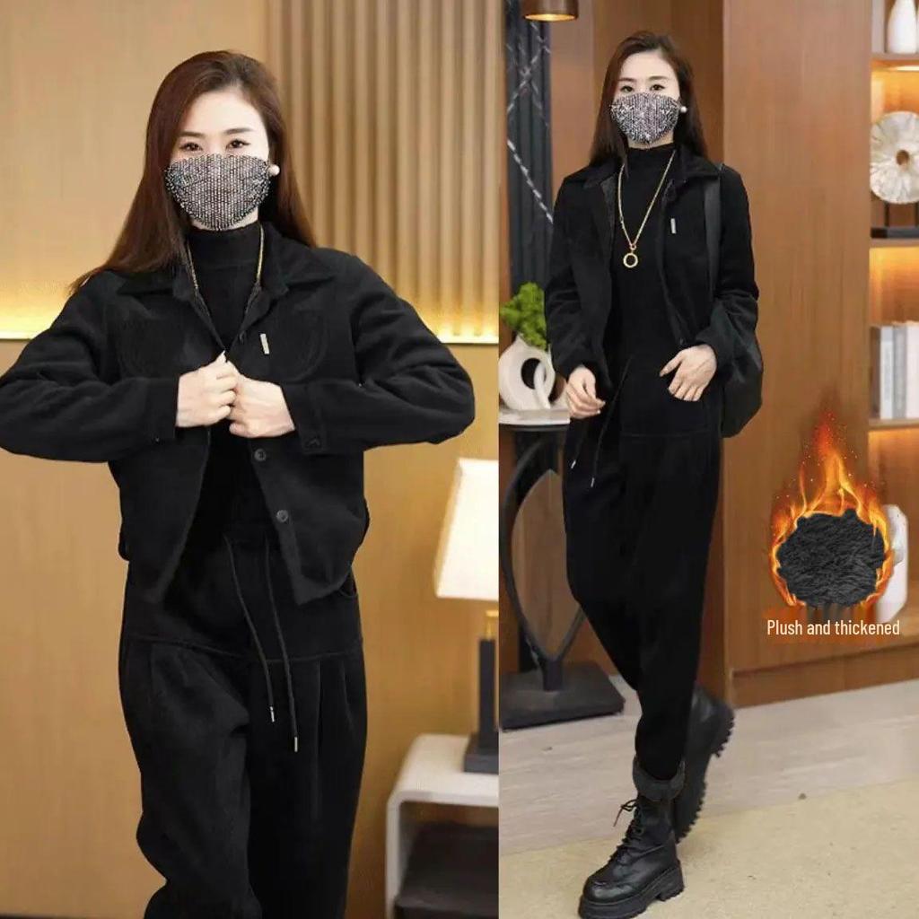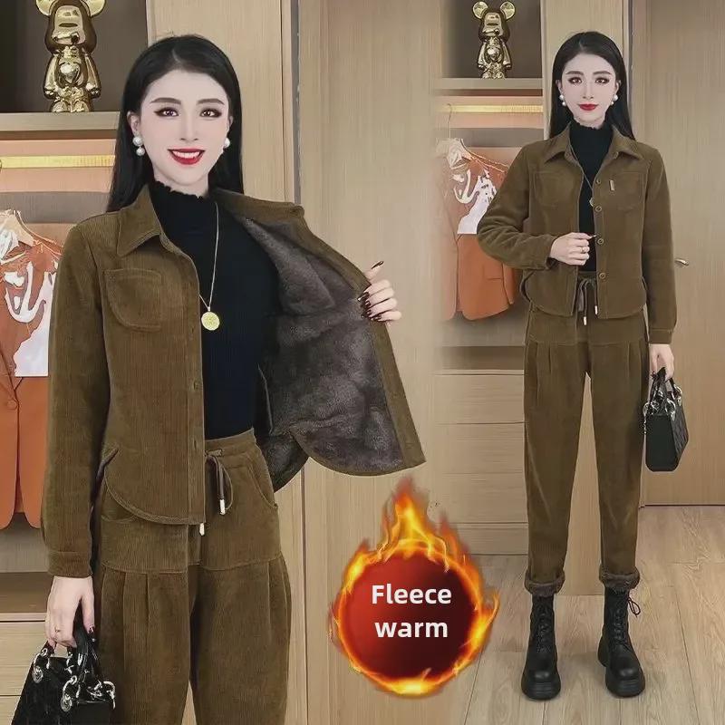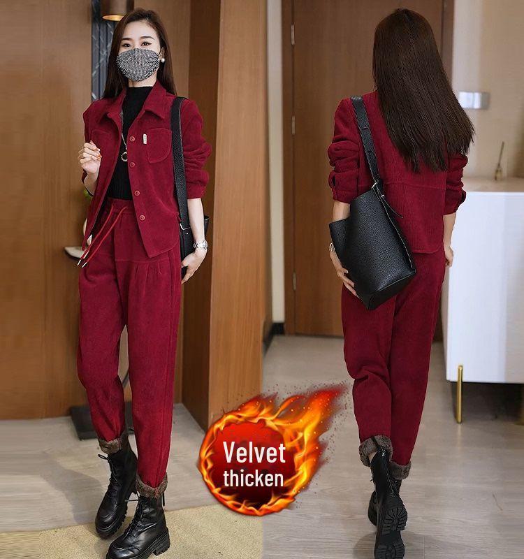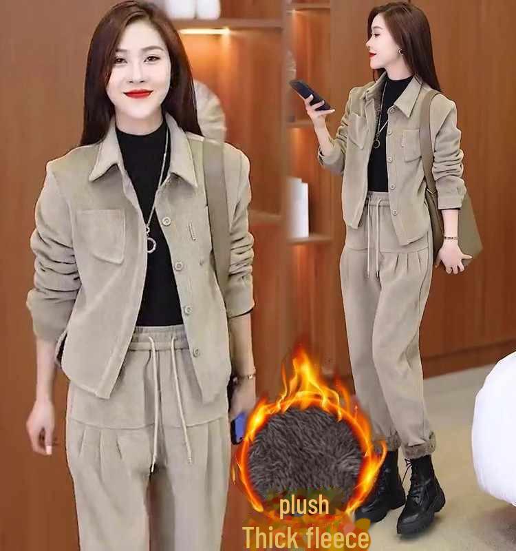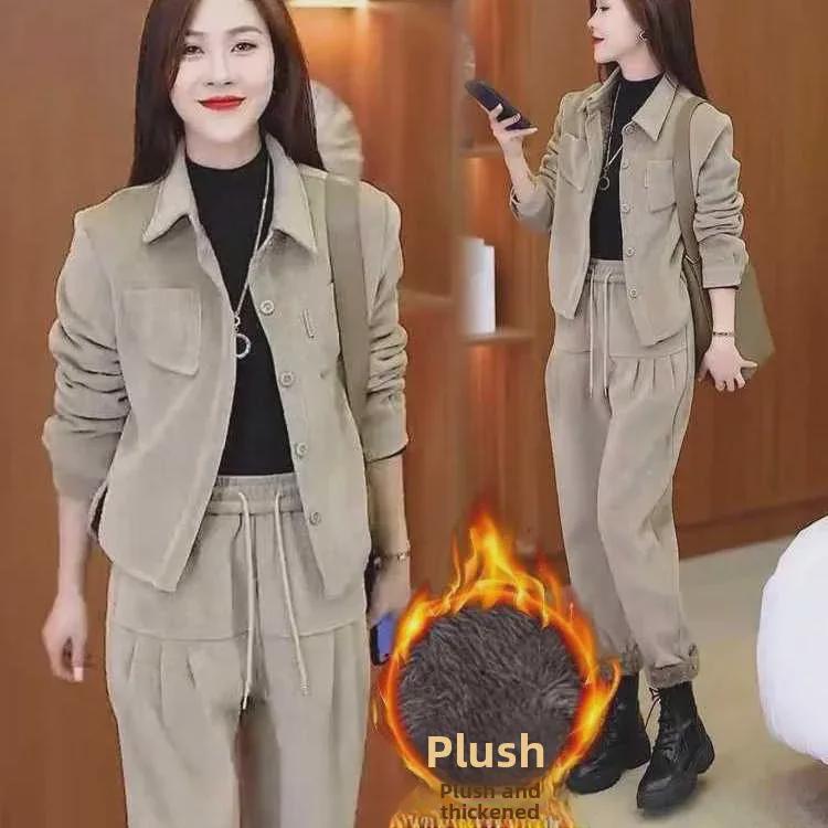Женский вельветовый костюм-двойка в корейском стиле 2024 года: Осенне-зимняя мода с плюшевым бархатом для элегантности, замедляющей старение