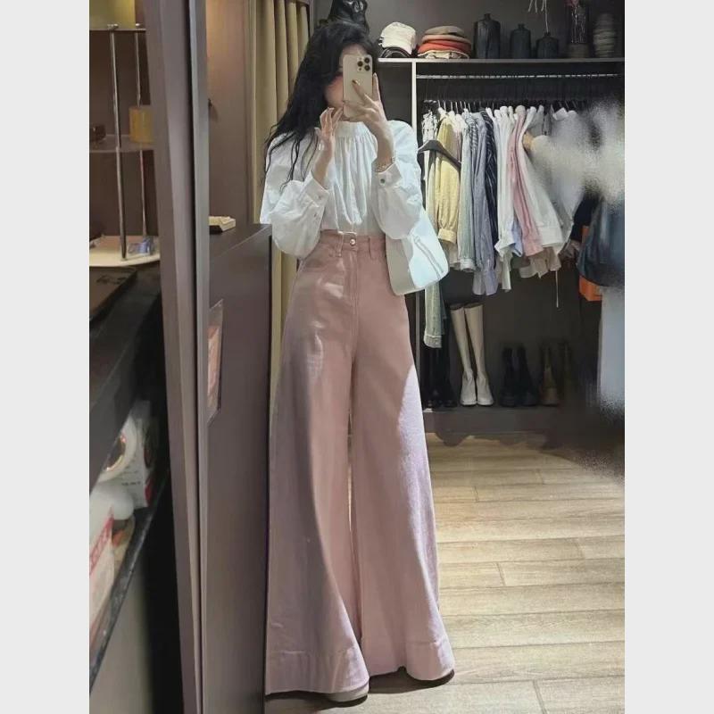 Джинсы розового цвета с высокой талией и широкими штанинами для женщин в корейском стиле — стройнящие, универсальные, тренд весны/лета 2025 года — купить товар онлайн с бесплатной доставкой до всему миру!