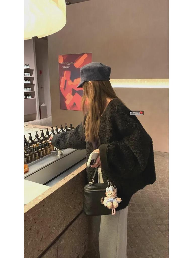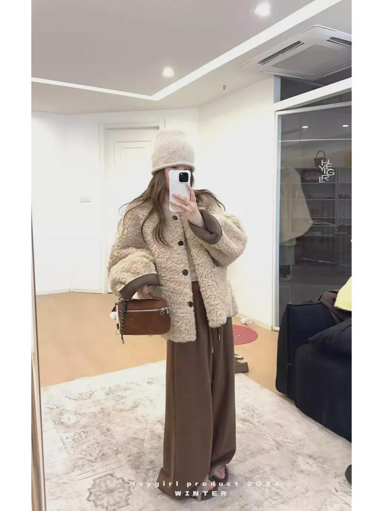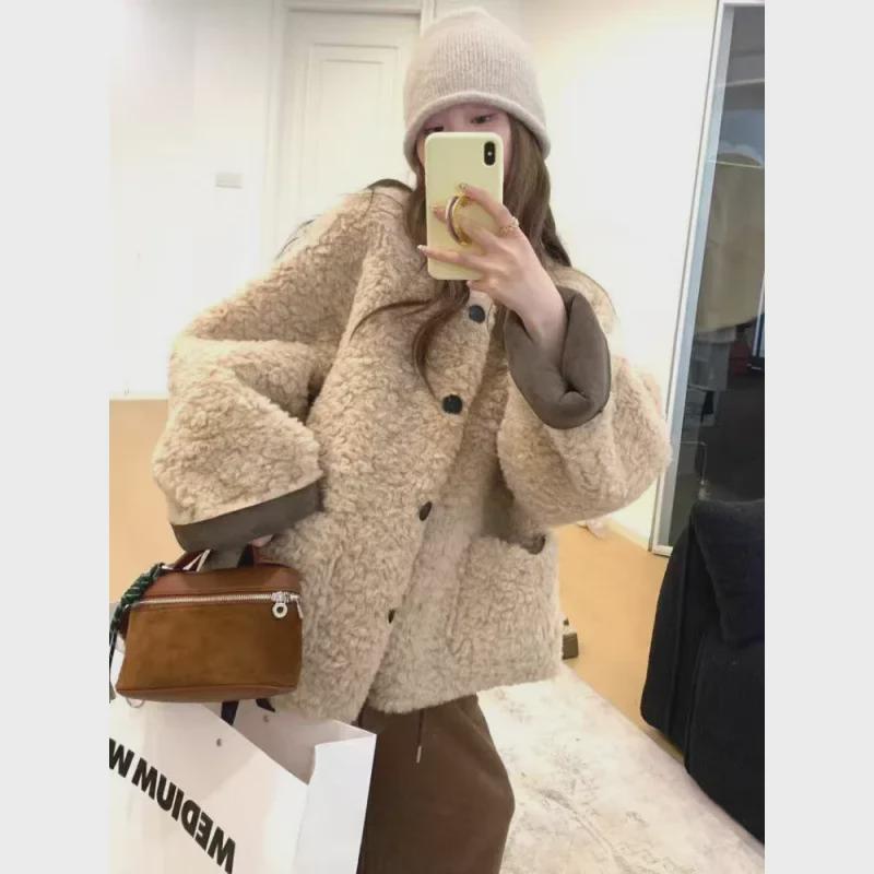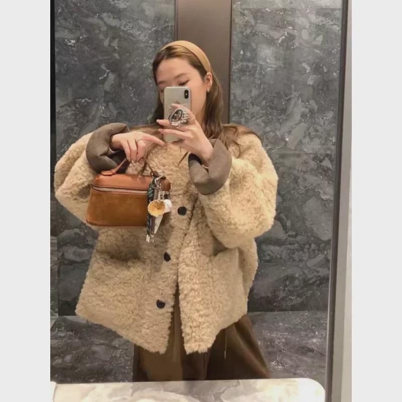 Женская зимняя утолщенная шуба из овечьего меха - Высококачественный повседневный топ из искусственной кожи с круглым вырезом