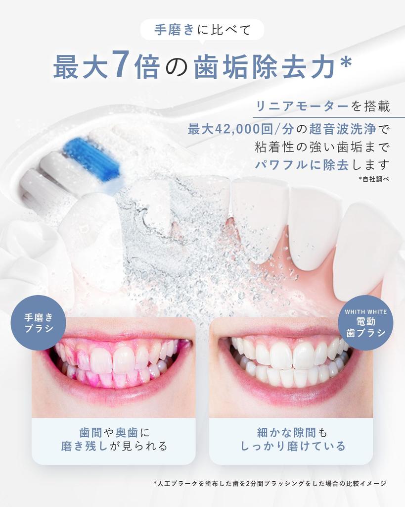 🦷 [Использует линейный двигатель] Ультразвуковая электрическая зубная щетка с ультразвуковой очисткой приблизительно 35 000–42 000 раз в минуту, которая удаляет зубной камень в 7 раз эффективнее, чем ручная чистка! (*Внутренние исследования) Он способен полностью удалить налет с тех участков, которые невозможно очистить вручную.