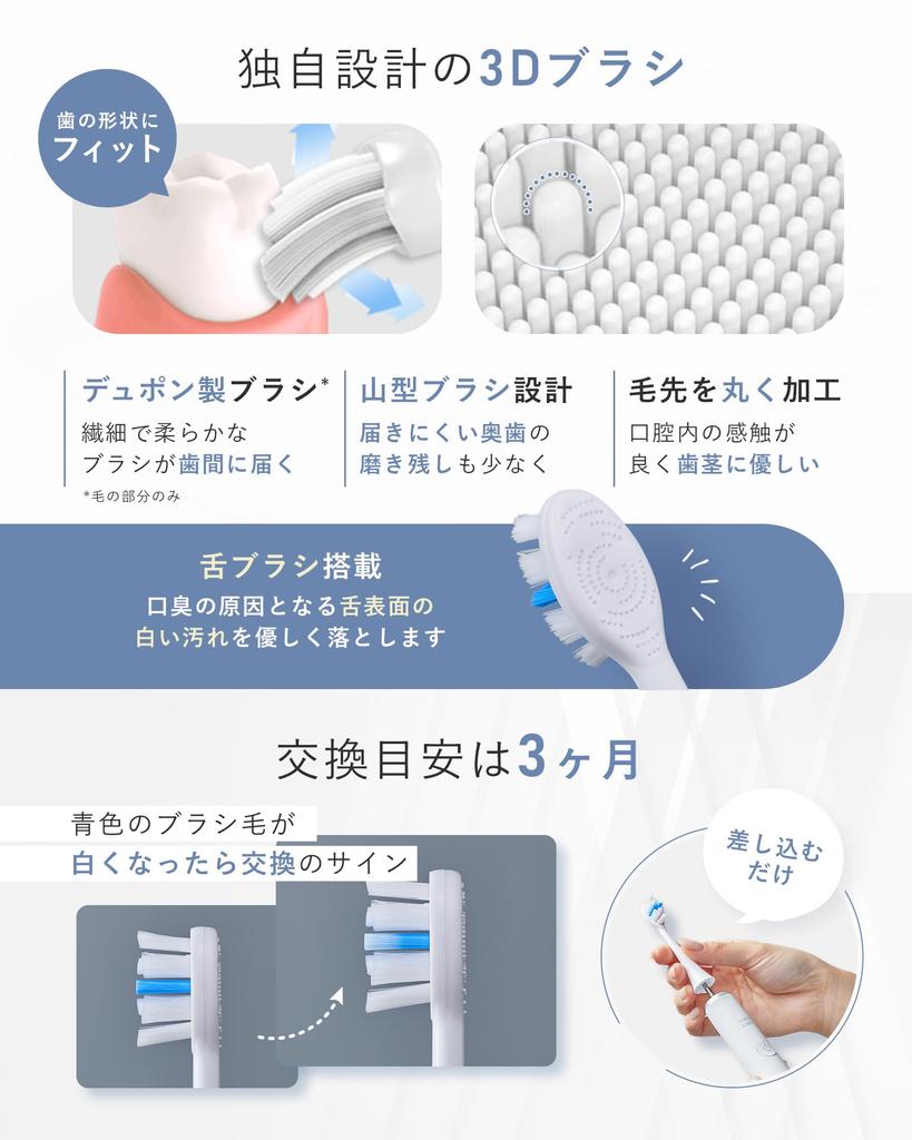 🦷 [Уникальная 3D-кисть] Использует нежную и мягкую «кисть Dupont*». (*Только щетина) «Конструкция щетки Ямагата» естественным образом достигает задних зубов, которые трудно чистить. Кончики щетинок закруглены, что обеспечивает приятные ощущения во рту и бережное отношение к деснам.. В комплект также входит «щеточка для языка»! Мягко удаляет белые загрязнения с поверхности языка, вызывающие неприятный запах изо рта.