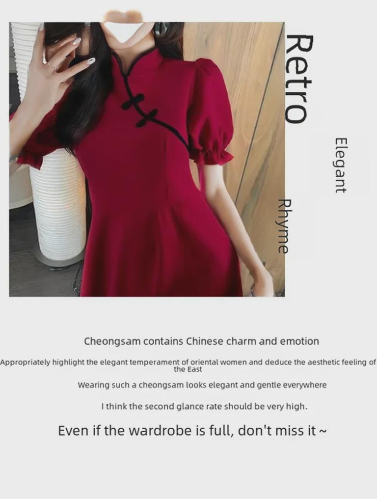 Улучшенное черное платье-чеонгсам для женщин: Средней длины, узкая талия, А-силуэт, рукава-фонарики, высокая талия, элегантный стиль