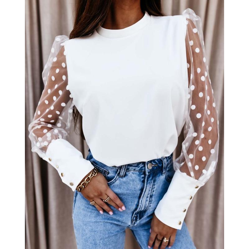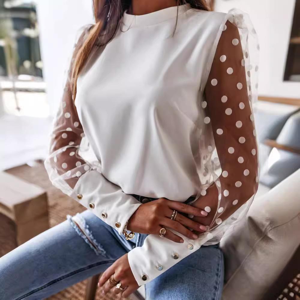 Весна-лето женская однотонная сетчатая блузка с длинным рукавом в стиле пэчворк