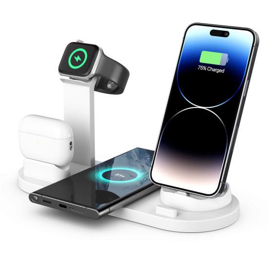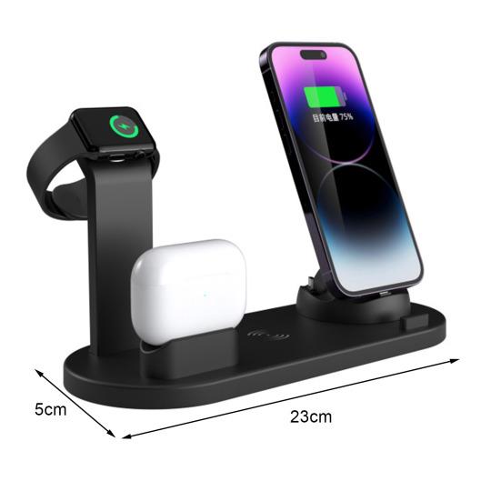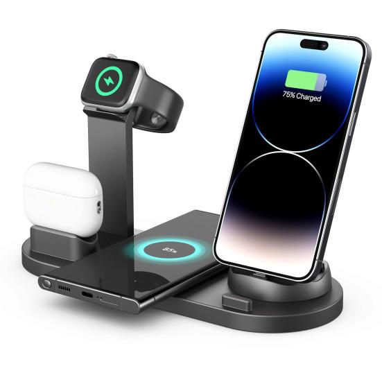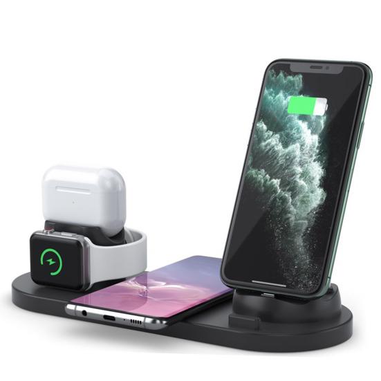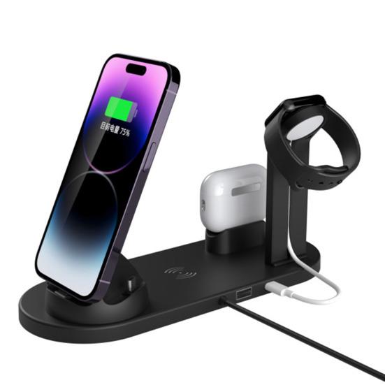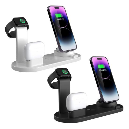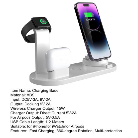 Эта интеллектуальная беспроводная зарядная станция сочетает в себе беспроводную зарядную панель и базовое зарядное устройство с 3 разъемами, что позволяет заряжать телефон, часы и наушники одновременно..