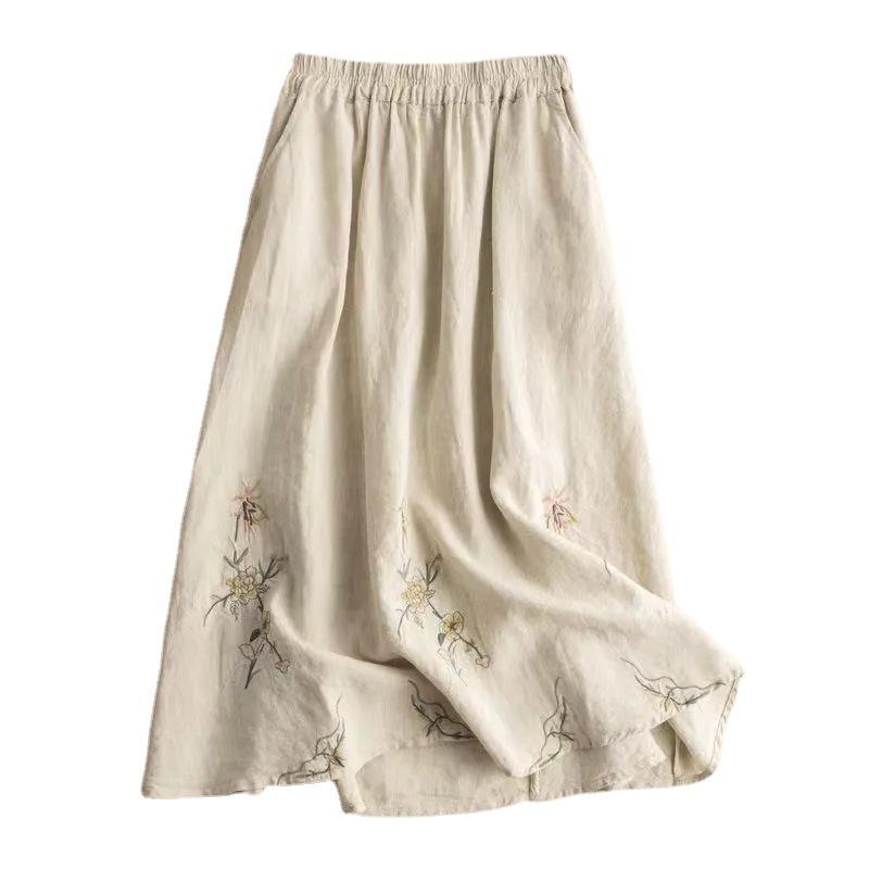 Женская юбка миди из хлопка и льна с вышивкой в стиле ретро 2024 года — однотонная, облегающая, универсальная летняя одежда