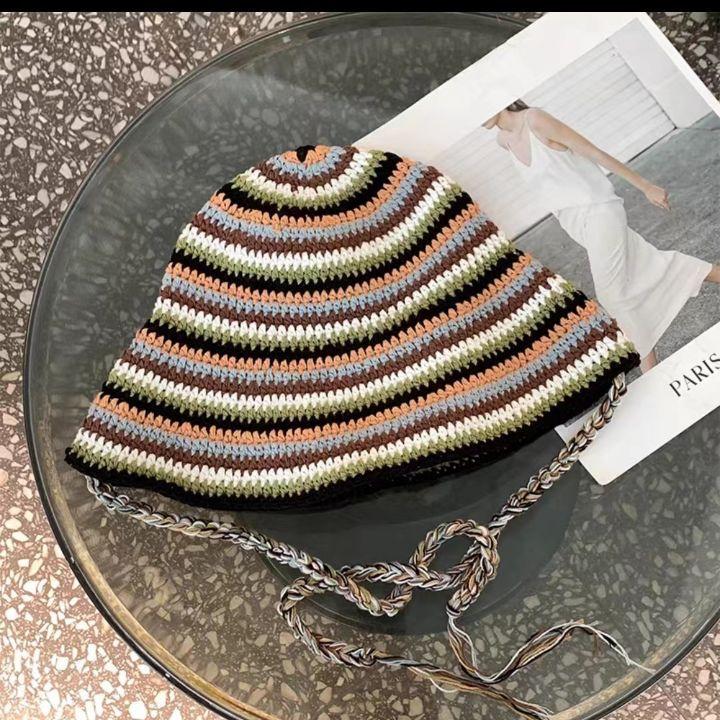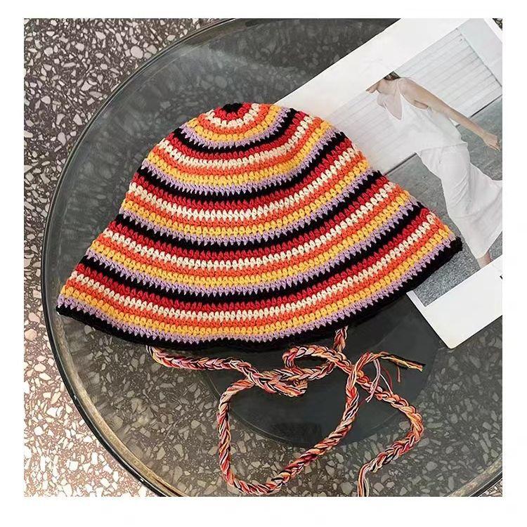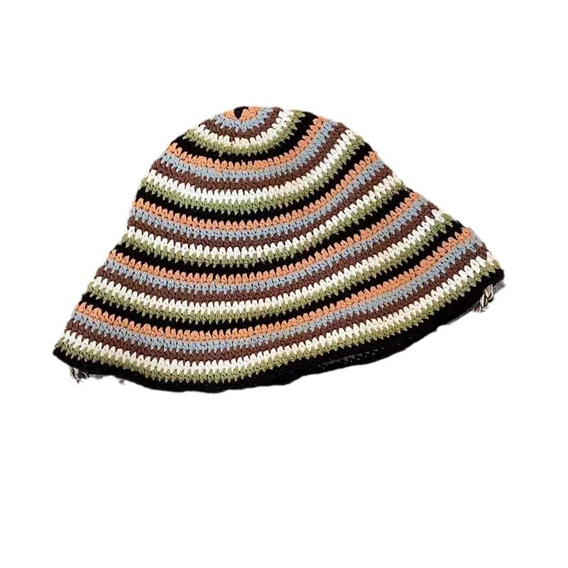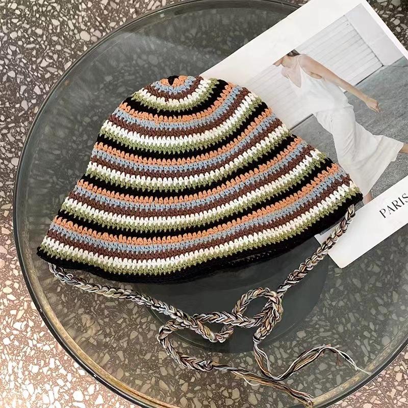 Mori контрастные полосы ручной вязки полые лямки плетеная шляпа-ведро женская вогнутая шляпа-тазик шляпа от солнца